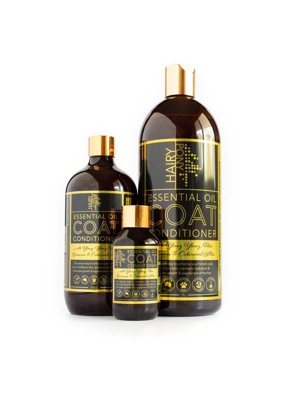 LIQUID GOLD! HAIRY PONY ESSENTIAL OIL HORSE COAT CONDITIONER is a natural way of enhancing your horse's shiny & healthy coat by conditioning the skin, maintaining hydration, and promoting growth & suppleness of the hair. Use daily during grooming or as a deep nourishing hot oil treatment.