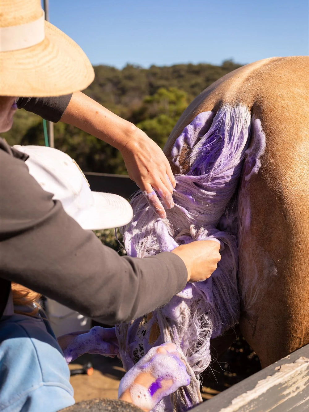 Say hello to beautifully white & bright manes, tails & coats with our new purple horse shampoo.