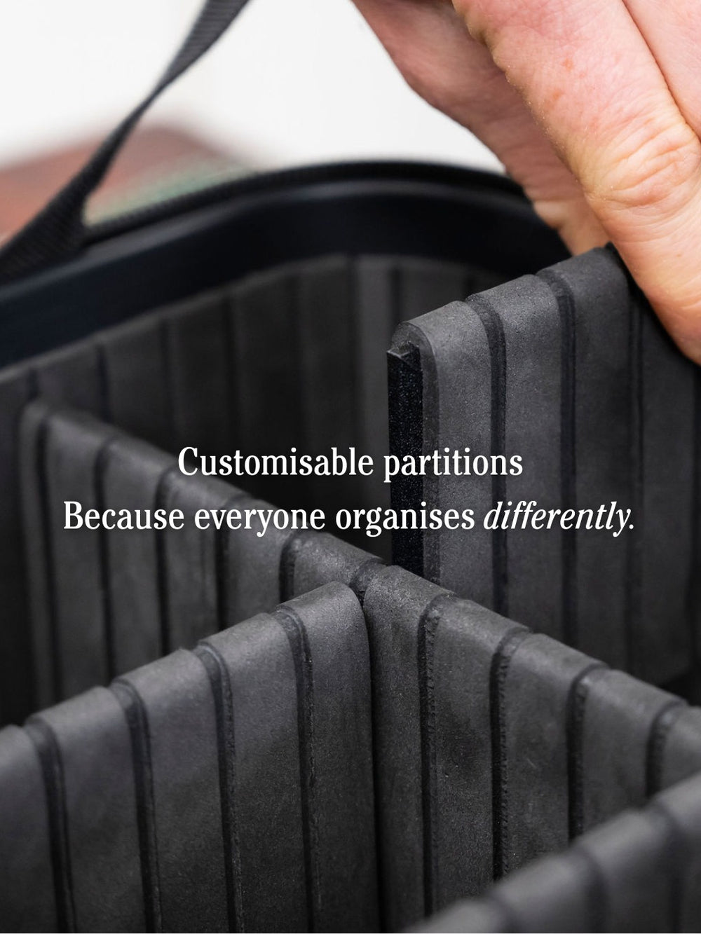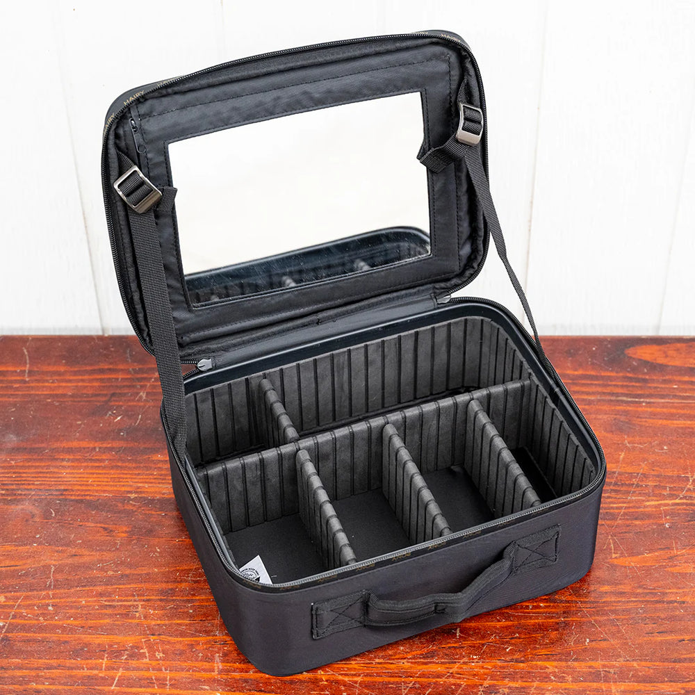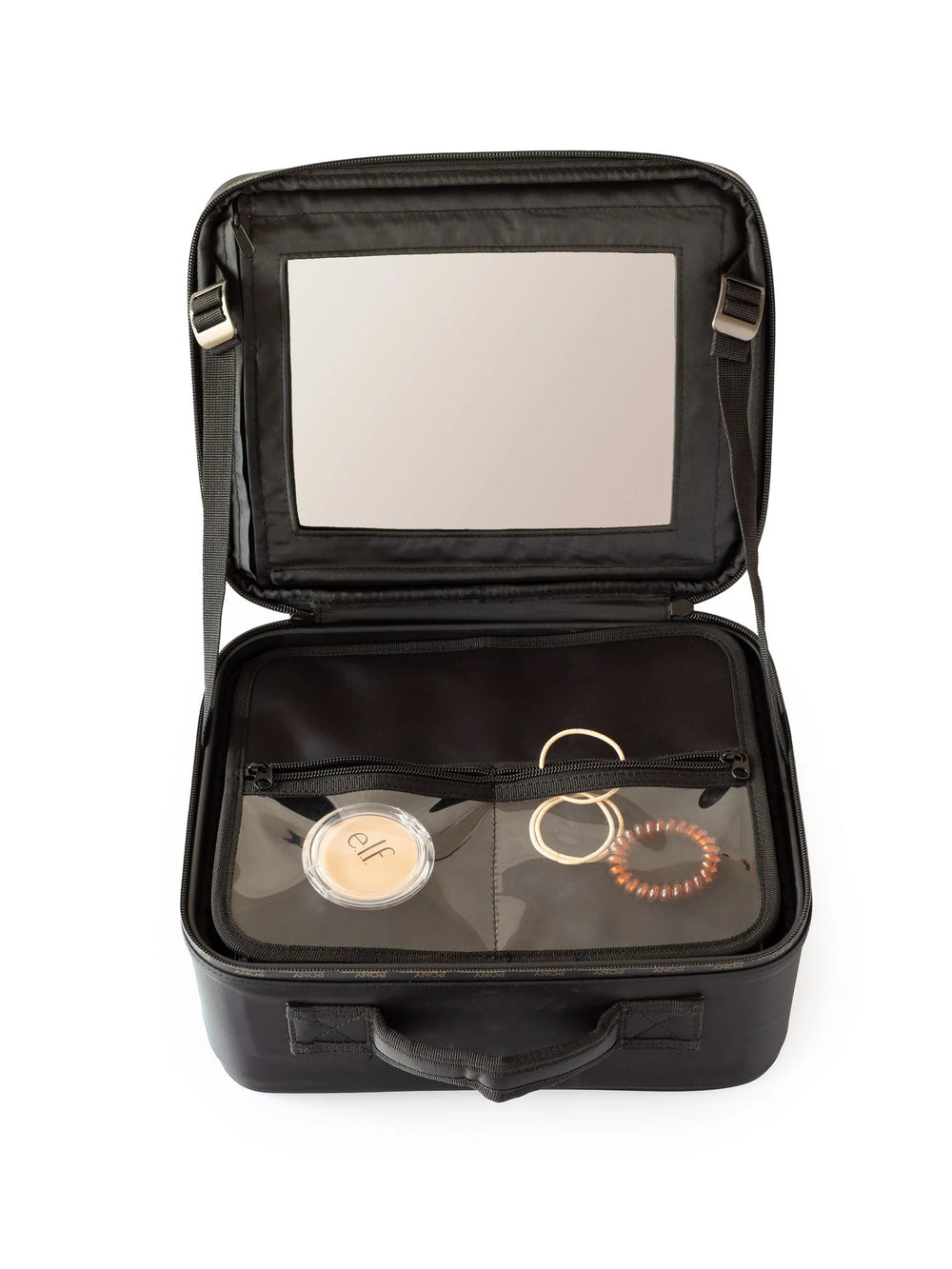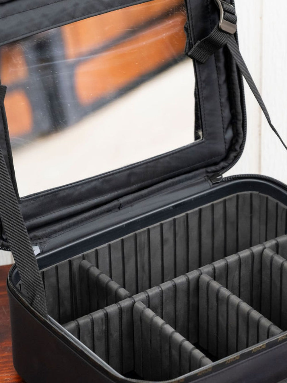 The designated storage case features a built-in mirror, an inner cover with clear pockets, and customisable partitions so you can easily arrange your items exactly how you like them.
