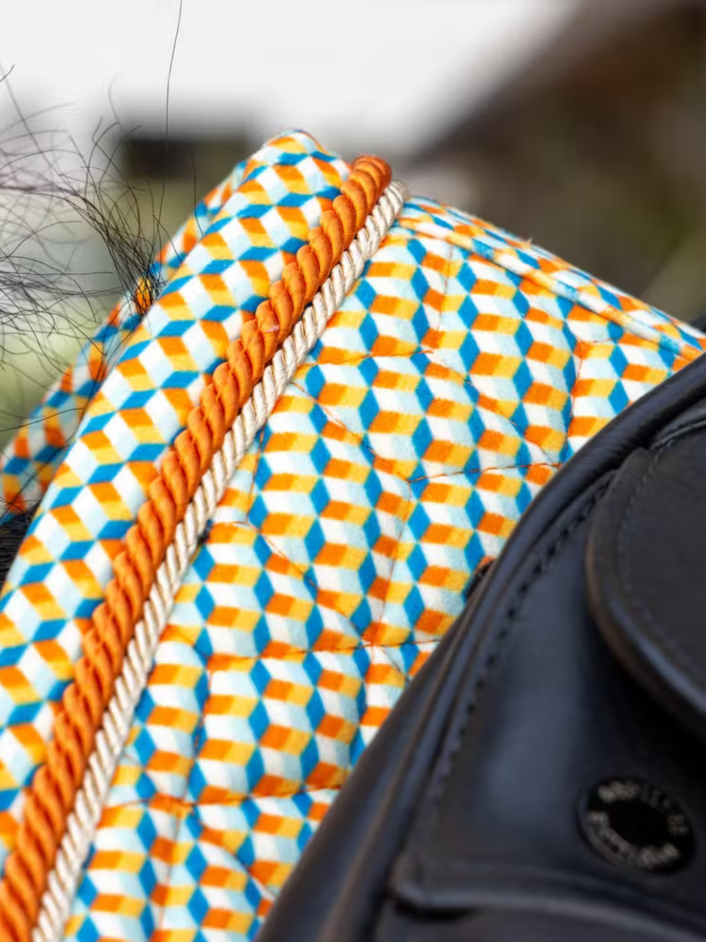 This limited edition saddle pad stands out with its truly original printing on the velvet fabric, making it unlike anything else in the collection. The star quilting and elegant piping highlight its premium craftsmanship, while the functional quick-dry lining ensures your horse’s comfort during every session. Choose between the dressage shape or the show jumping shape to suit your riding needs, and complete the look with the matching fly veil for a polished, harmonious appearance.