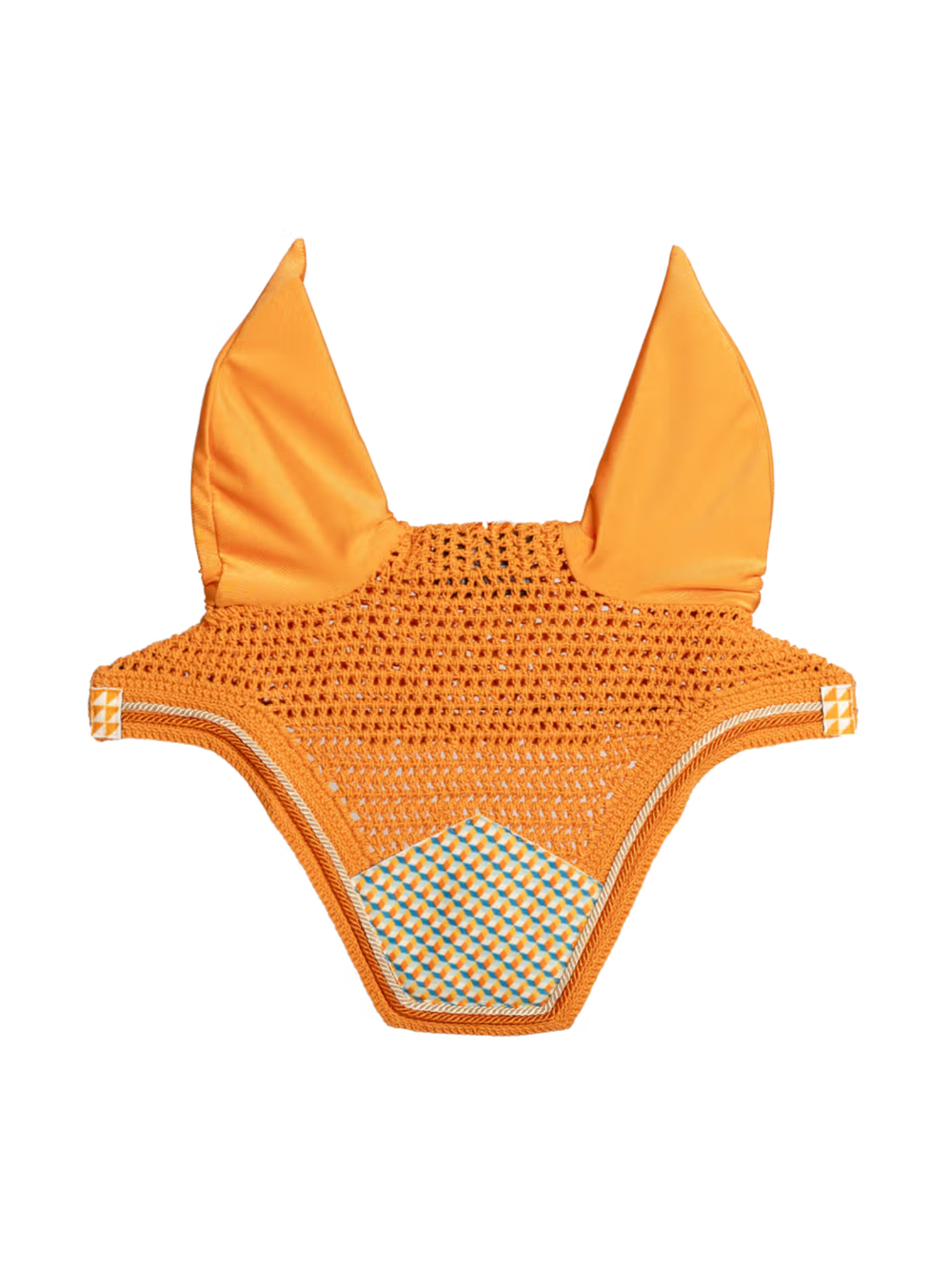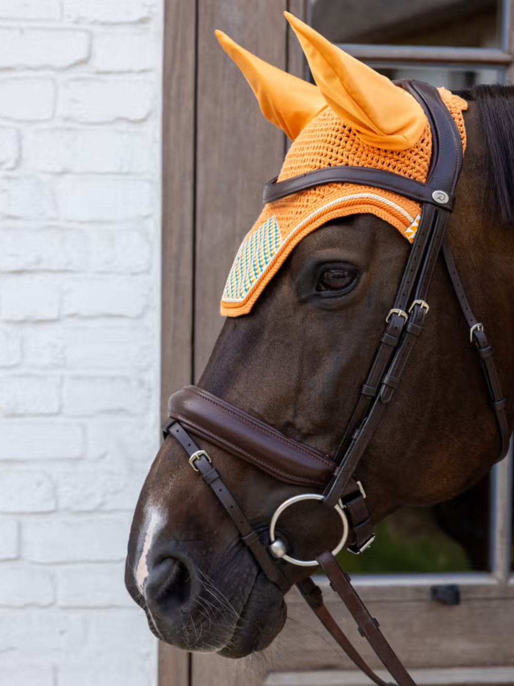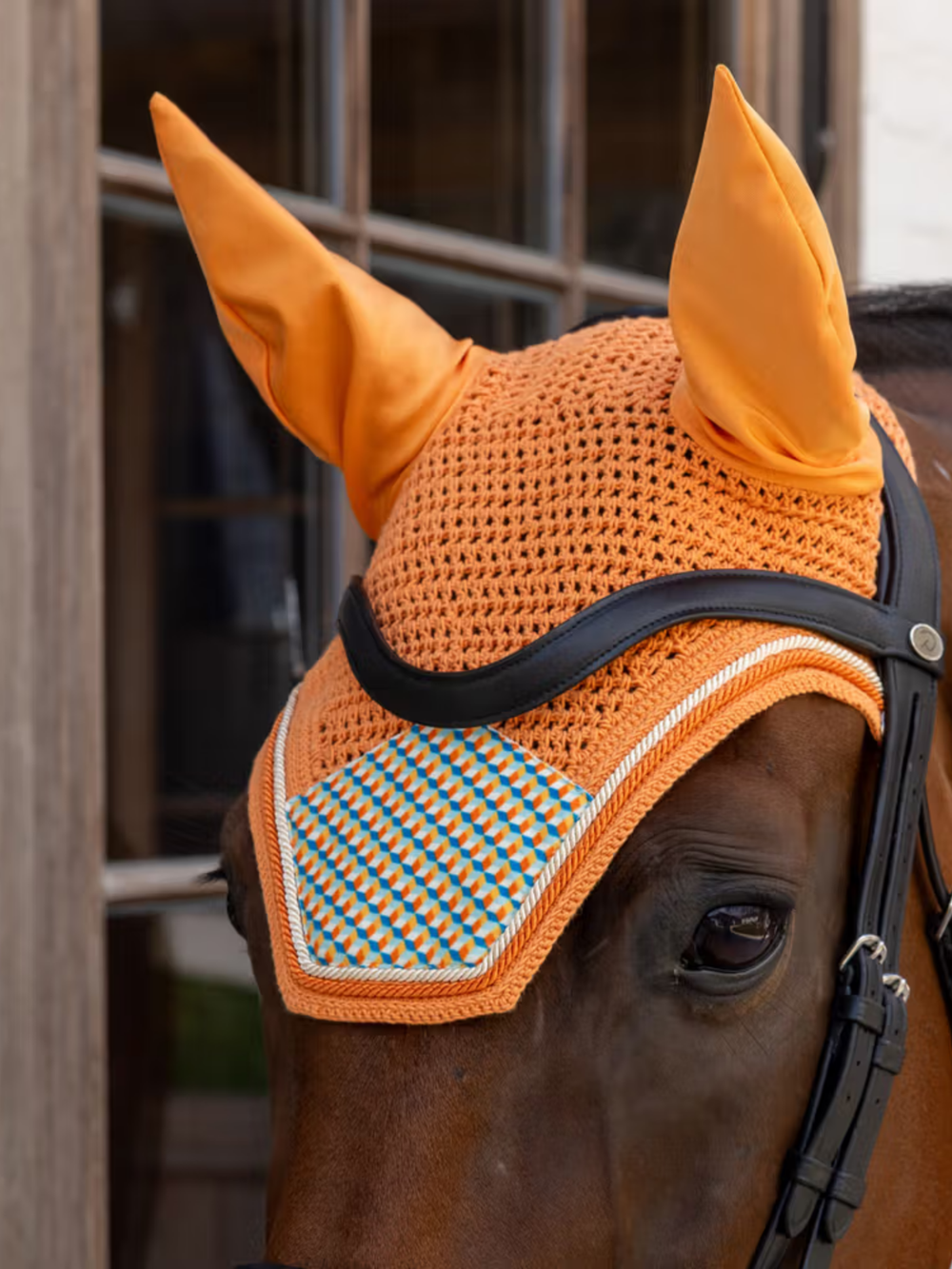 This fly veil stands out with its luxurious velvet details and exclusive printings, making it more than just functional – it’s a true statement piece. The longer neck part ensures it stays securely in place, while the stretch fabric around the ears guarantees a comfortable fit. Subtle yet elegant, it matches seamlessly with the Velvet Printing Saddle Pad for a coordinated, stylish look.