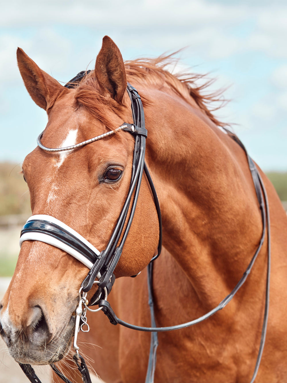 The double bridle model Cassidy features round stitching and a wide noseband. Its design is both timeless and elegant, available in a variety of color combinations as standard.