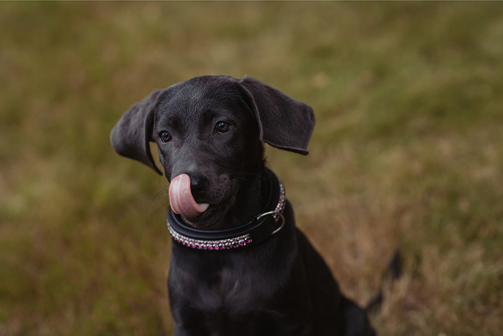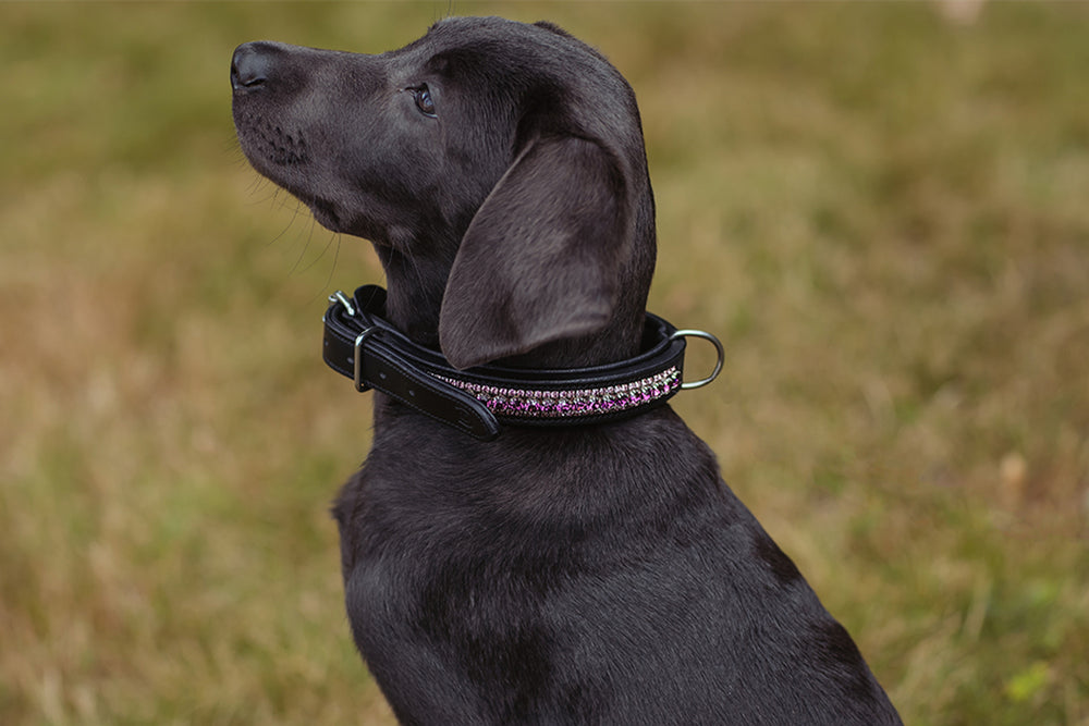 Stylish, adjustable dog collar in dark brown leather with beautiful lilac crystals. Comfortable, high-quality leather with soft padding on the inside. Well-anchored loop for the leash. The collar is available in several sizes to fit both small and large dogs.