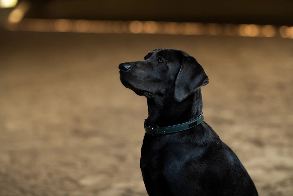 Elegant and comfortable dog collar in a beautiful cool dark green color. Soft padding on the inside in a black colour. Decorated with an Equestrian Stockholm badge in black.