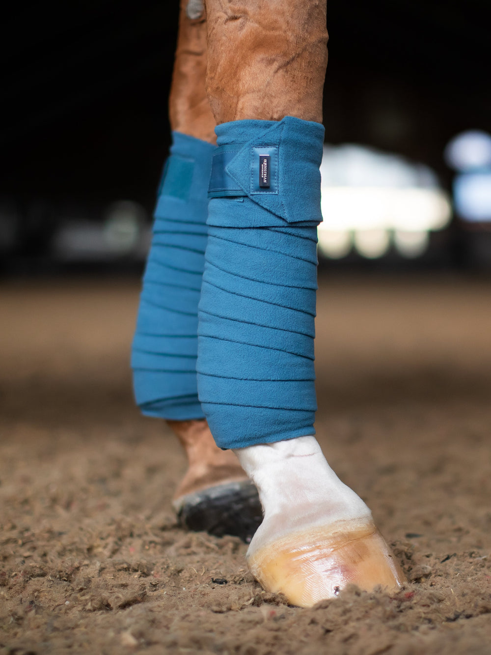 High quality polo wraps in an elegant blue colour. Decorated with blue satin details and an Equestrian Stockholm badge in silver. Style with the saddle pad and ear bonnet from the Amalfi collection to complete a glamorous look. Fleece bandages are sold in sets of four.