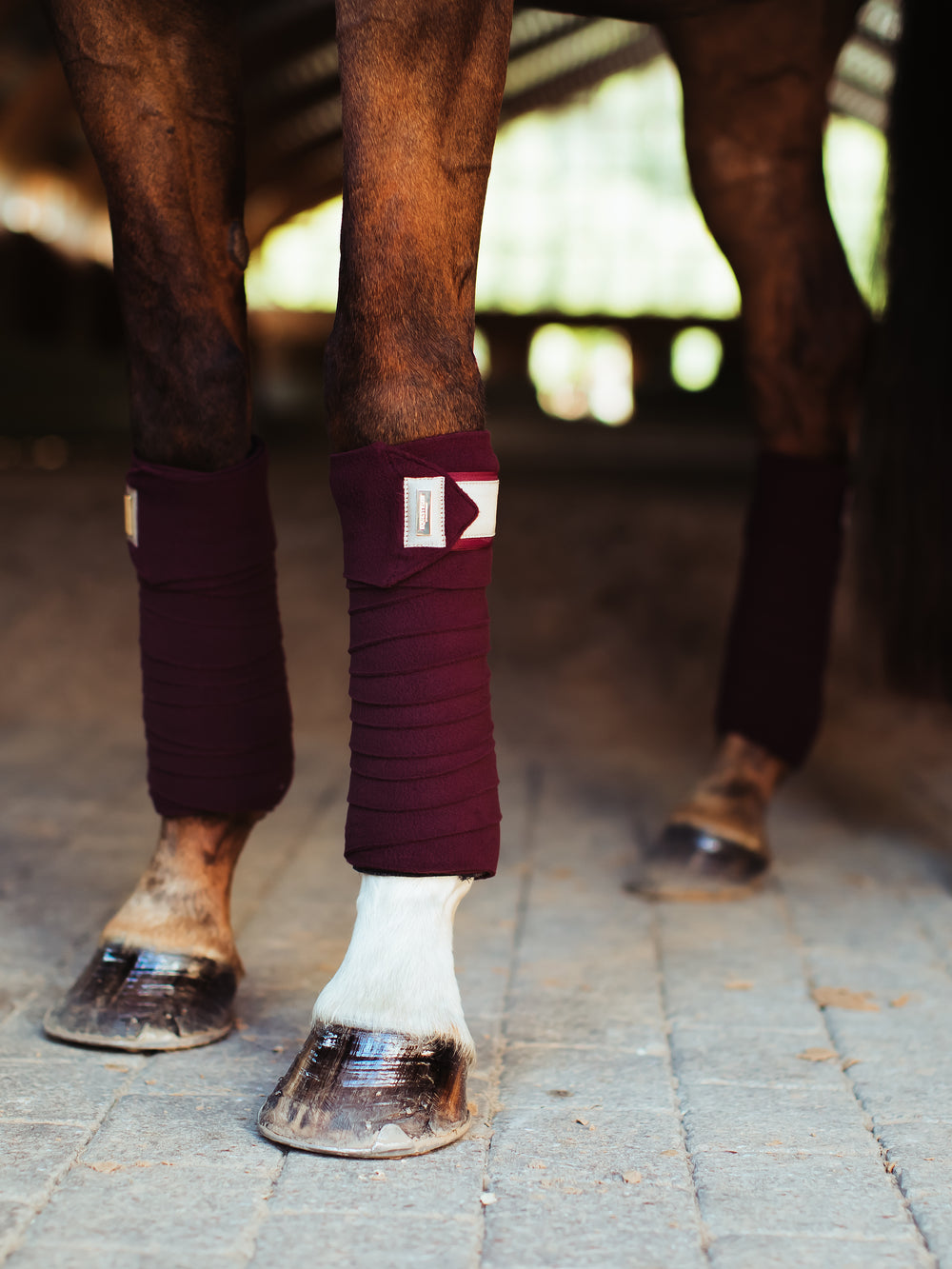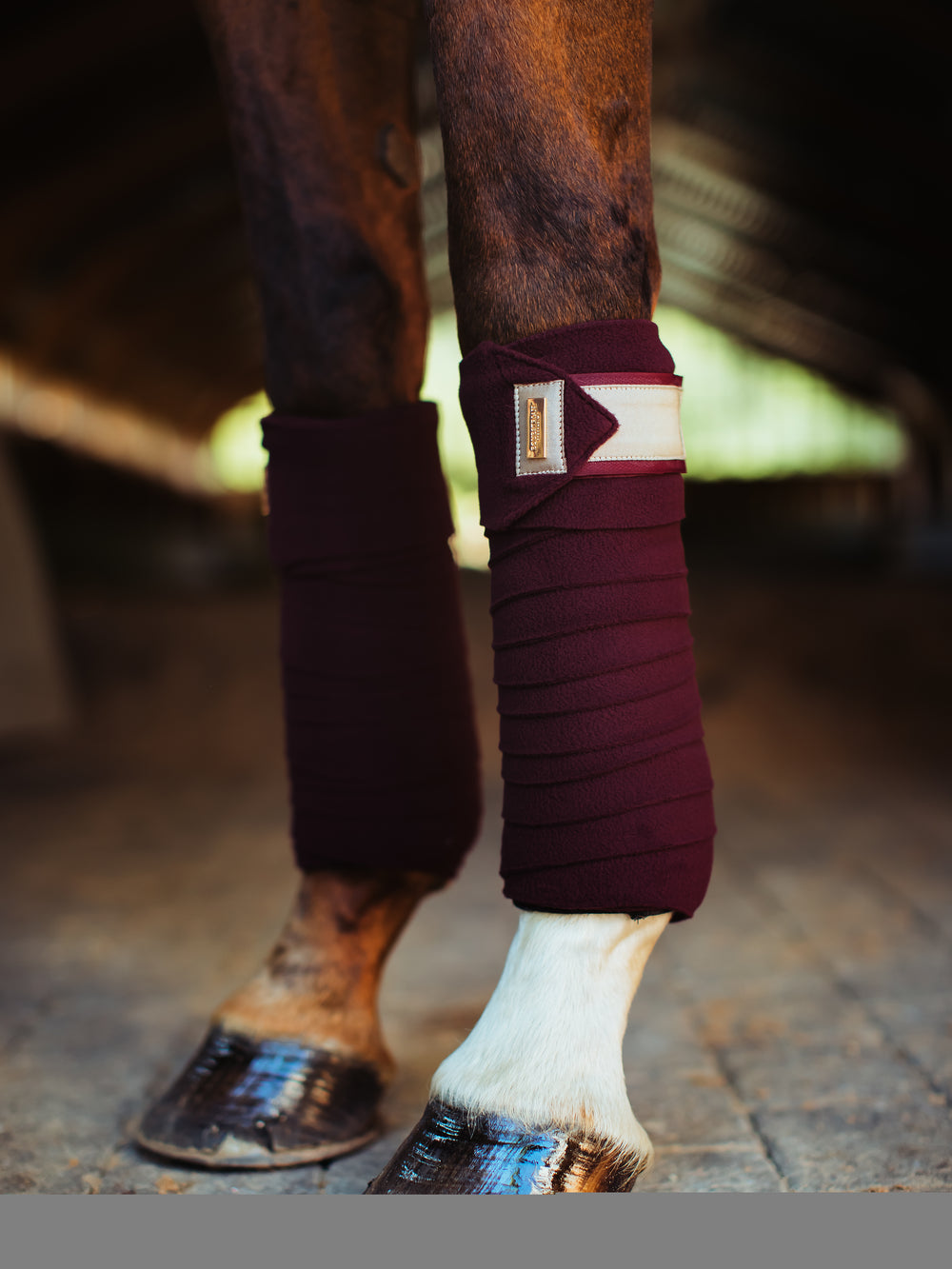 High quality fleece bandages in a romantic merlot nuance. Decorated with beige details and ES badge in gold. Style with the saddle pad and ear net from our Crystal Merlot Gold collection to complete the glamorous look. Sold in sets of four.