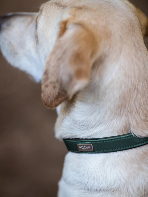Elegant and comfortable dog collar in a beautiful emerald green colour. Created in 100% high quality buffalo leather and we use a sustainable dyeing process with fruits and vegetables, where no chemicals are used. Soft padding on the inside in a navy colour. Decorated with an Equestrian Stockholm badge in silver.