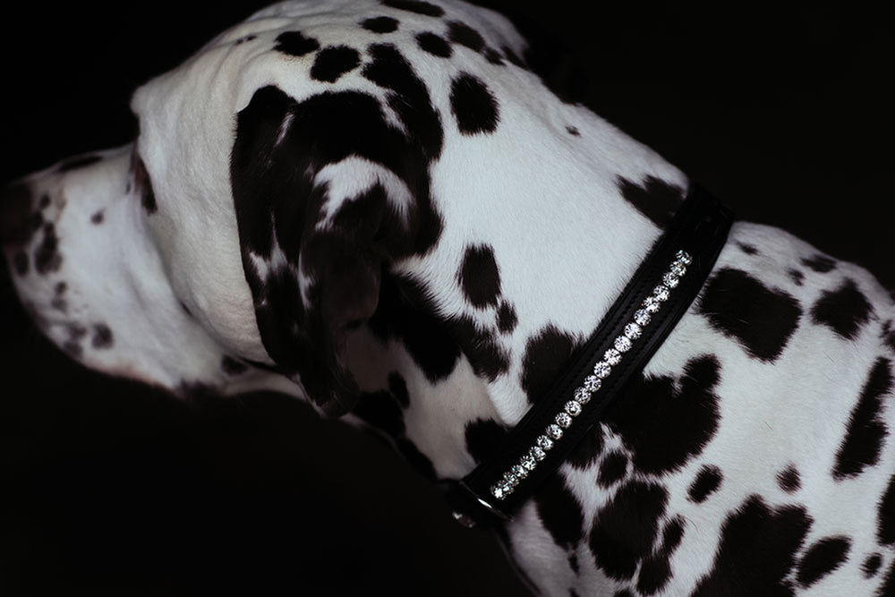 Stylish, adjustable dog collar in black leather with beautiful silver rhinestones. Comfortable, high-quality leather with soft padding on the inside. Well-anchored loop for the leash. The collar is available in several sizes to fit both small and large dogs.