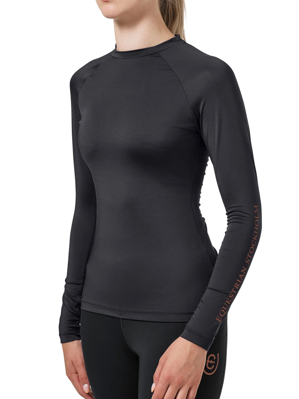 Designed to accommodate various body types, this riding top offers a superior fit compared to regular sleeves, allowing for enhanced freedom of movement and a flattering silhouette. The stylish black color, complemented by a sleek white logo print on both sleeves, makes it a perfect blend of style and performance.