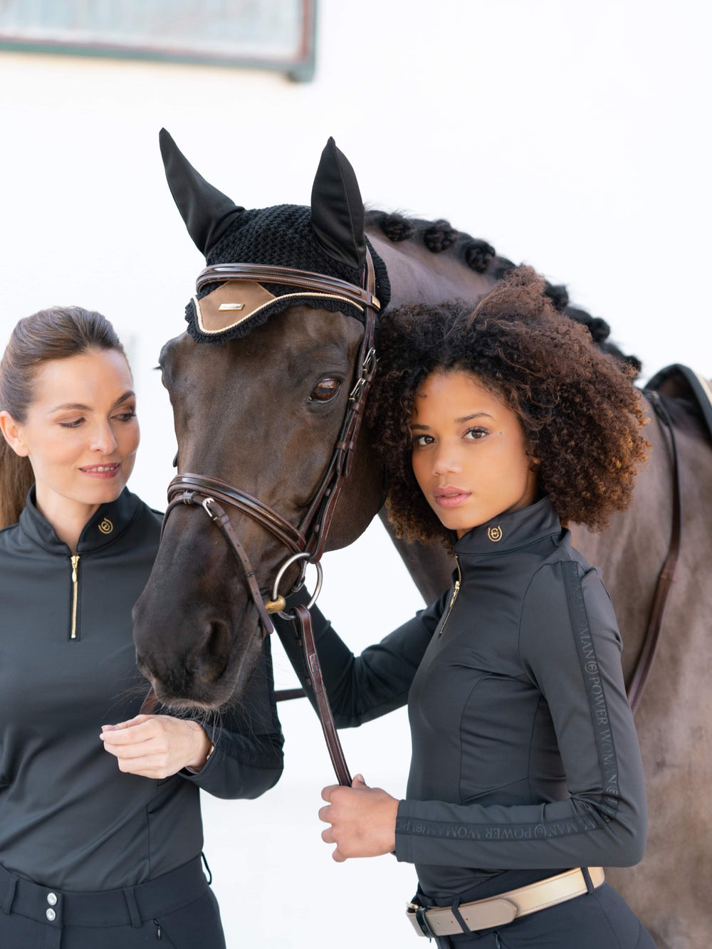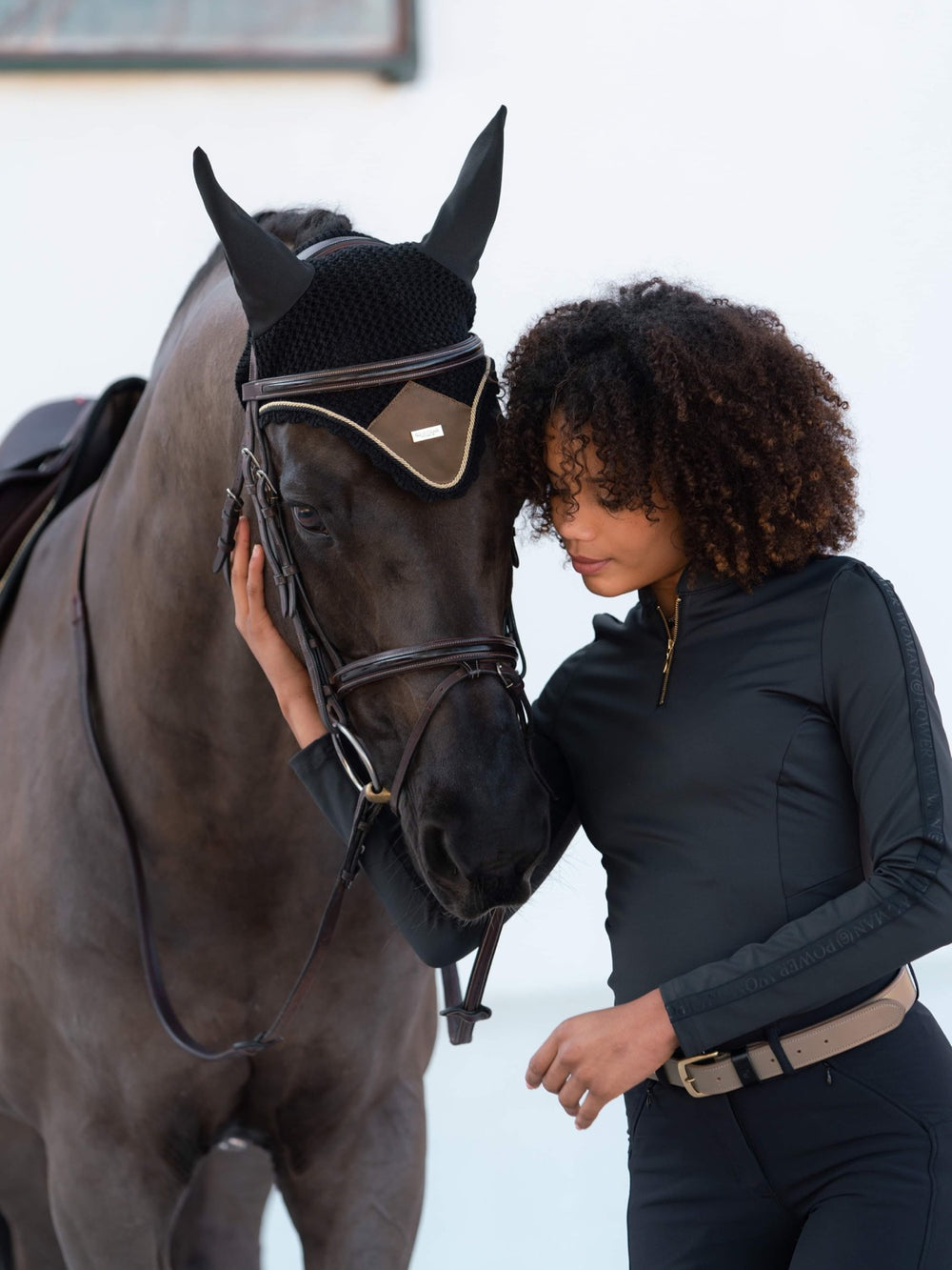 The coolest color combination of the season is here! Luxurious ear net designed in black with gold and ‘Golden Brass’ details. It protects your horse from both insects and noise. Crocheted ear net with elastic cloth by the ears to prevent gall. Style with other pieces from the same collection for a complete look.
