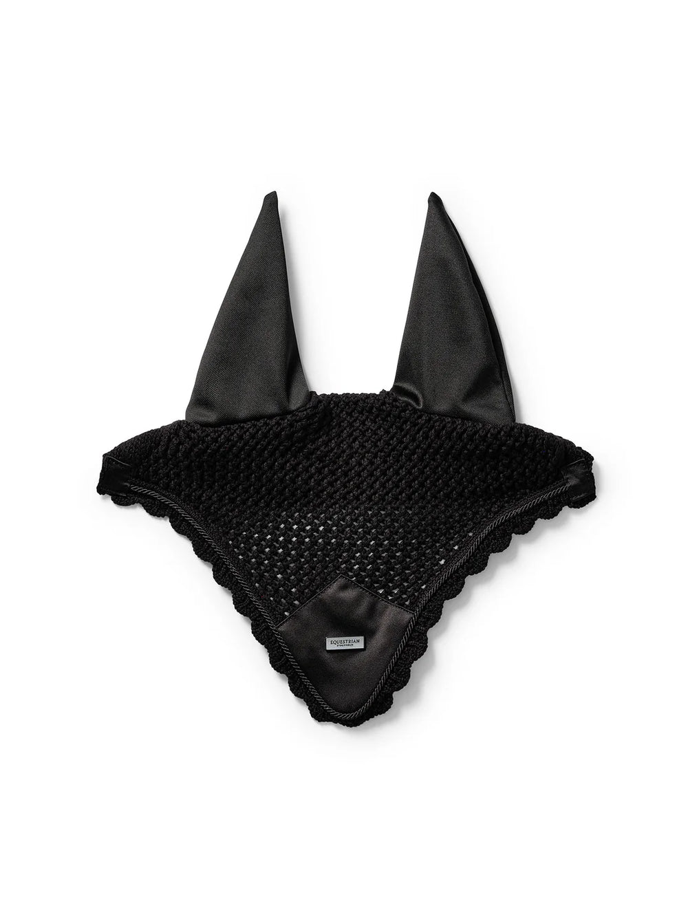 Luxurious, crocheted ear bonnet in a stylish black colour. Decorated with a black satin patch on the front, black edge border, and a silver Equestrian Stockholm badge. The ear net provides both insect protection and noise reduction. It has elastic cloth on the ears for extra comfort.