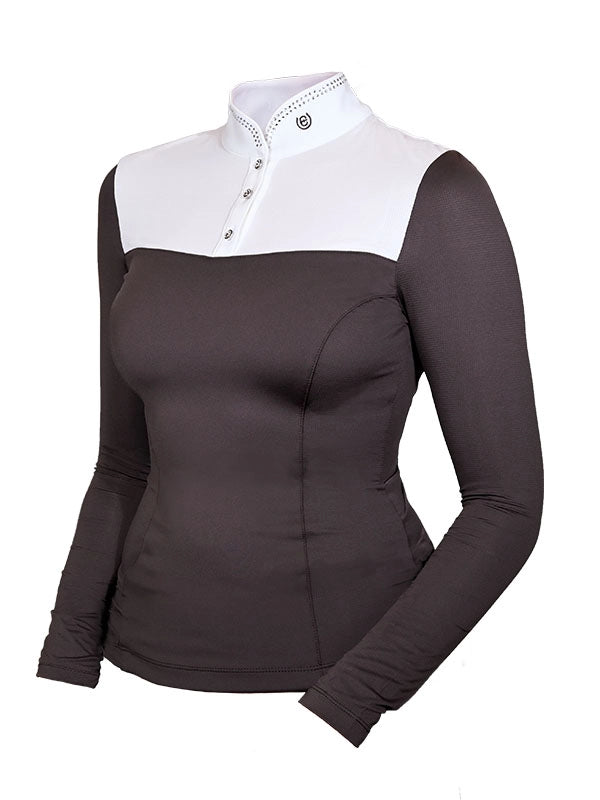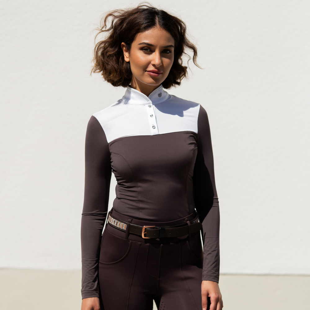 The Revenew Competition Top is designed in a beautiful brown/purple color with white details. Decorated with beautiful crystals along the collar edge and crystal buttons at the front which will make you stand out from the crowd when competing.