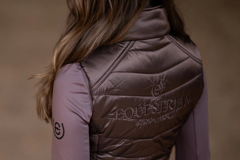Elegant vest in brown with a touch of purple with luxurious chrome details. Lightweight, made with water resistant fabric and recycled padding. The padding contains recycled coffee grounds which function as an odour control. This keeps your vest feeling fresh longer, which could mean fewer washes. Less wear on the vest, means less wear on the planet.