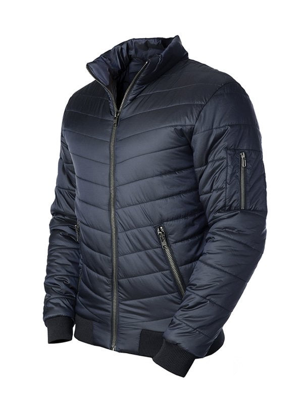 Bomber jacket in dark navy blue with luxurious chrome details. This jacket is one of our most responsibly made products yet with ECO fleece and ECO friendly filling instead of down. The filling keeps you warm, but it’s also wind -and water resistant. It also has odor control thanks to recycled coffee beans in the material. The odor control keeps your jacket fresh longer, which means fewer washes. Better for the jacket, better for the planet.