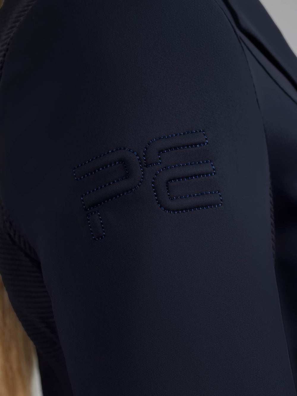 Classically cut, this competition jacket is formed to provide a flattering silhouette, with meticulously placed style lines. A traditional notched lapel collar sits at the top of a YKK zip, concealed by a clean, press stud closure. Two pockets offer a place for storing your valuables, with added security provided by zip closures of a matte finish. The subtle matte styling continues across the finer details of this jacket, including the branded press stud closures, and PE branding at the periphery of the cuff. Our signature chrome PE badge is situated on the rider’s left arm, presenting continuity with our existing collection. An embossed PE form is elegantly rested on the rider’s right arm, boasting the quality and functionality of this luxury performance jacket.