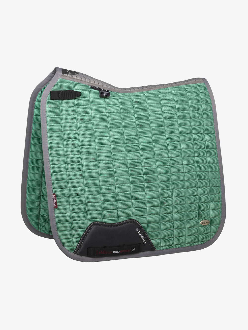 The LeMieux Self-Cooling Dressage Pads are made with the innovative 'Feel Cool' Ice material which has a cooling crystal kneaded into the weave. This is activated by moisture; the greater the moisture the greater the cooling effect! The crystals have incredible heat pick-up & transfer properties gradually absorbing and wicking sweat from the horse. Under extreme conditions, once dissipated a reverse rapid cooling effect is produced.