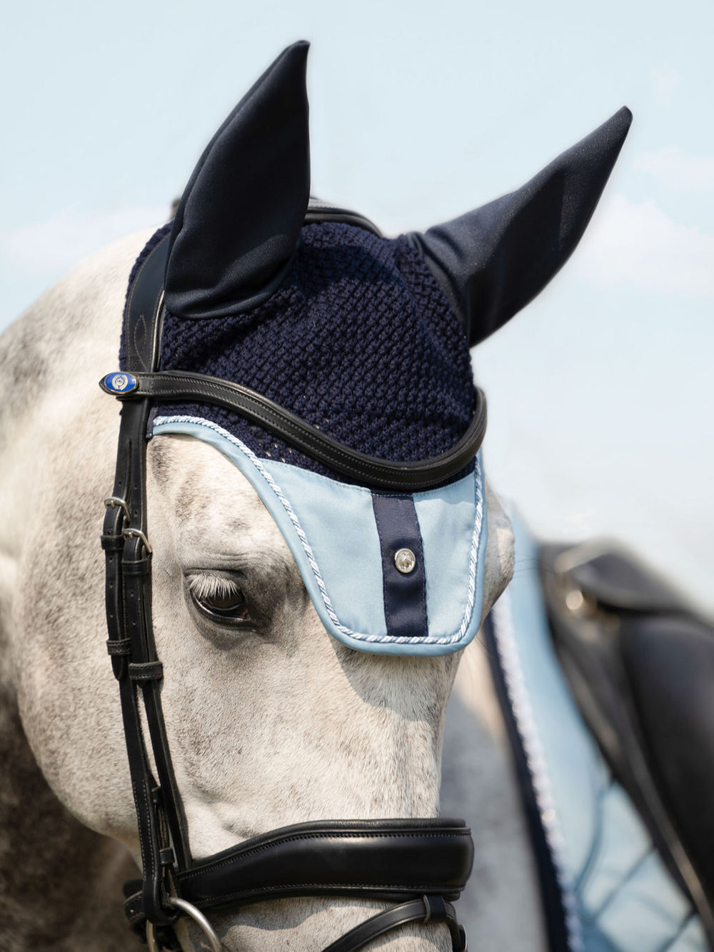 The ears are elastic and made of a stretchy, breathable, antimicrobial quick-dry material. The elastic fabric at the ears makes the fly hat fit all types of horses. It quickly transports moisture and sweat away during the whole ride. The fly hat has a classic, crocheted bottom, double piping, and the lower part of the fly hat is covered with shiny, dirt-repellent material.