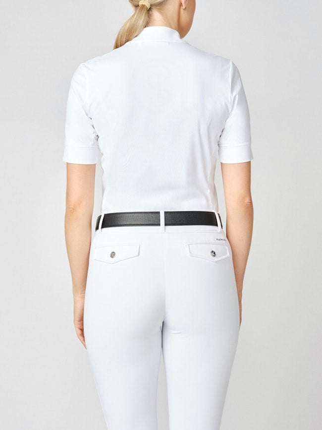 Short sleeve white competition shirt with half-zip, made in a super soft four-way-stretch. The slim fit combined with double mesh panels at the sides, offer optimal comfort under your show blazer; the shirt follows every move and breathes perfectly. Its classy, elegant details include stand-up collar and PS logos.