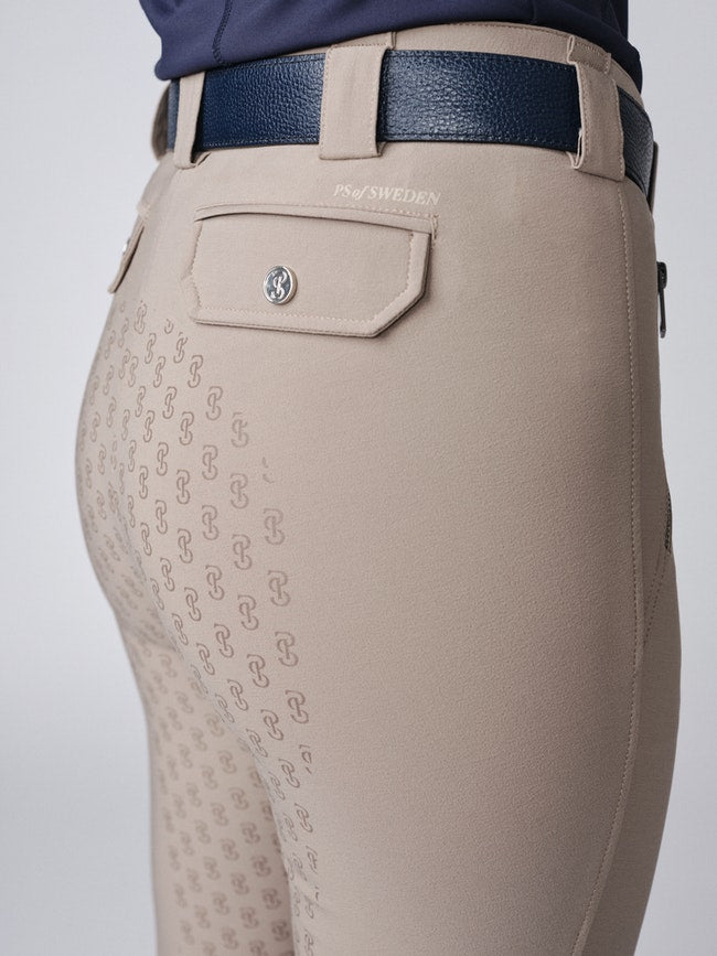 Mid waisted breeches with full grip. Made in our four-way-stretch material that offers a figure-hugging fit and optimal movability. Tonal mesh socks at the leg opening create compression and ensure the breeches' fit along the leg. Functional and stylish features such as zipped pockets at front and decorative pocket lids at back.