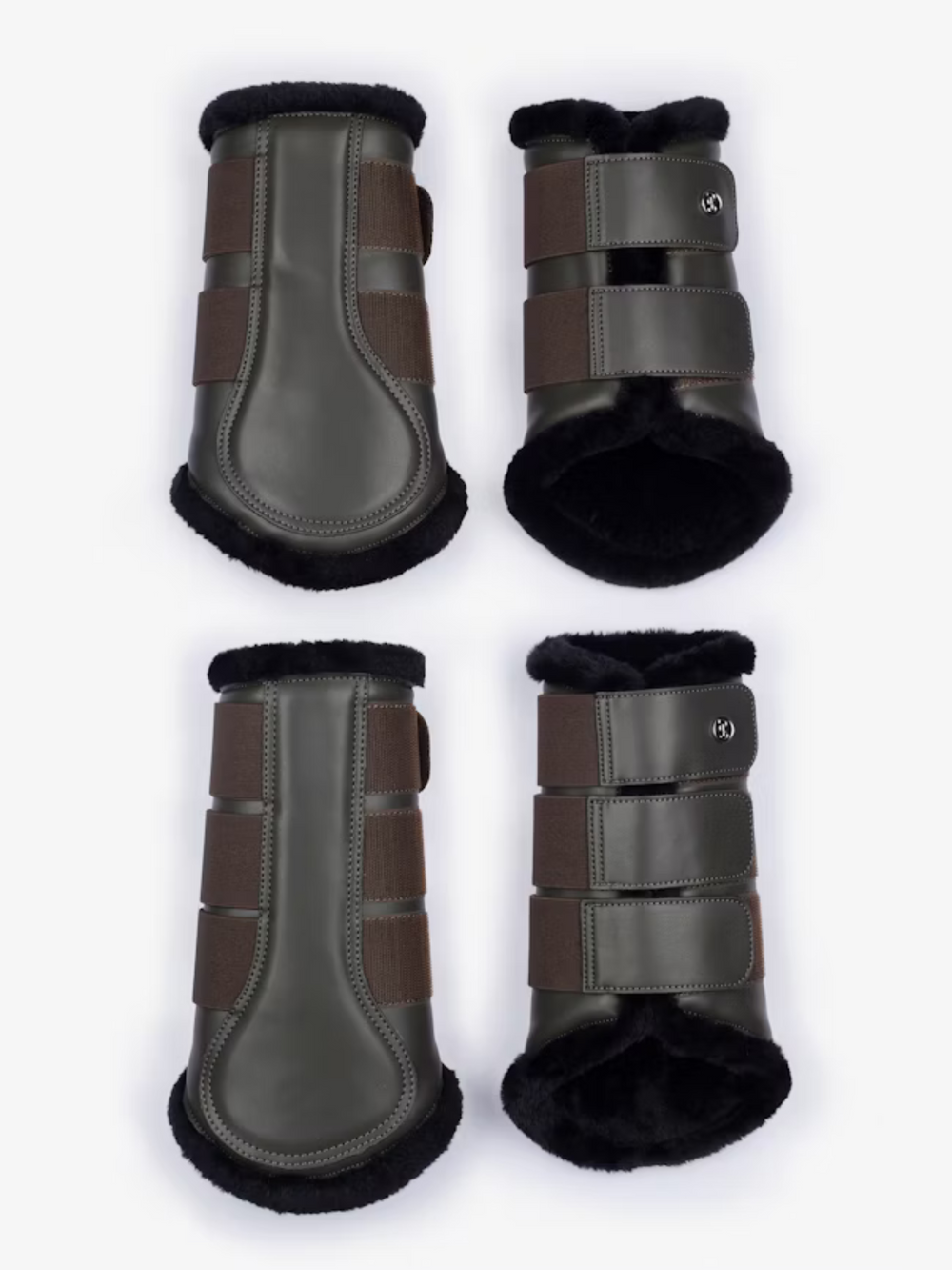 On this new edition of our brushing boots, we have combined many loved functions from our old style but of course, added updated details for an ever better fit. We have created a new outside using softer vegan leather, this will provide a more comfortable fit as it will adjust to the horse's leg. The brushing boots feature a padded patch on the inside to resist knocks and tears. We are using a fully coated soft padded inside with our beloved white faux fur. Front legs have two fastening straps and hind legs have three – all with one PS logo stud.