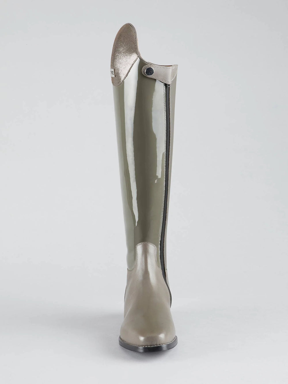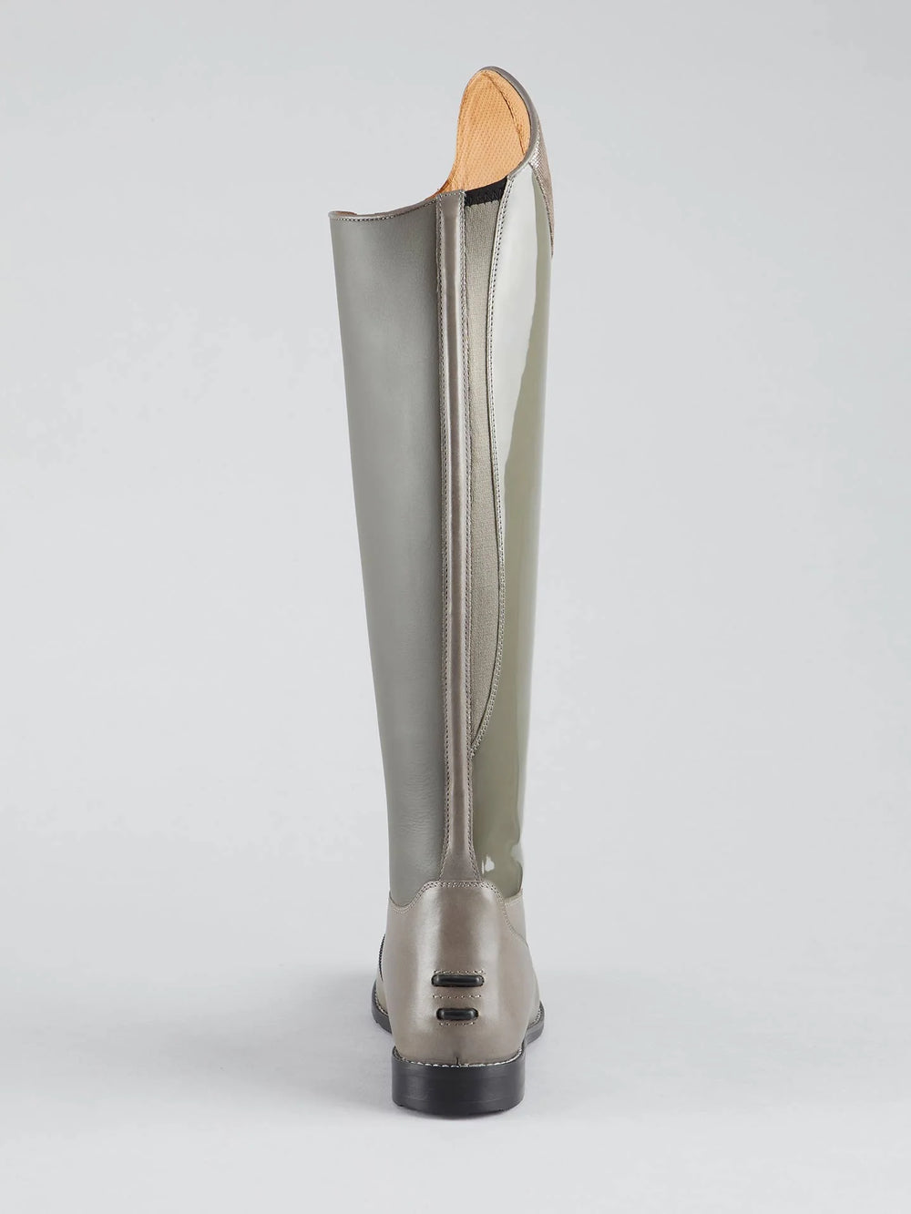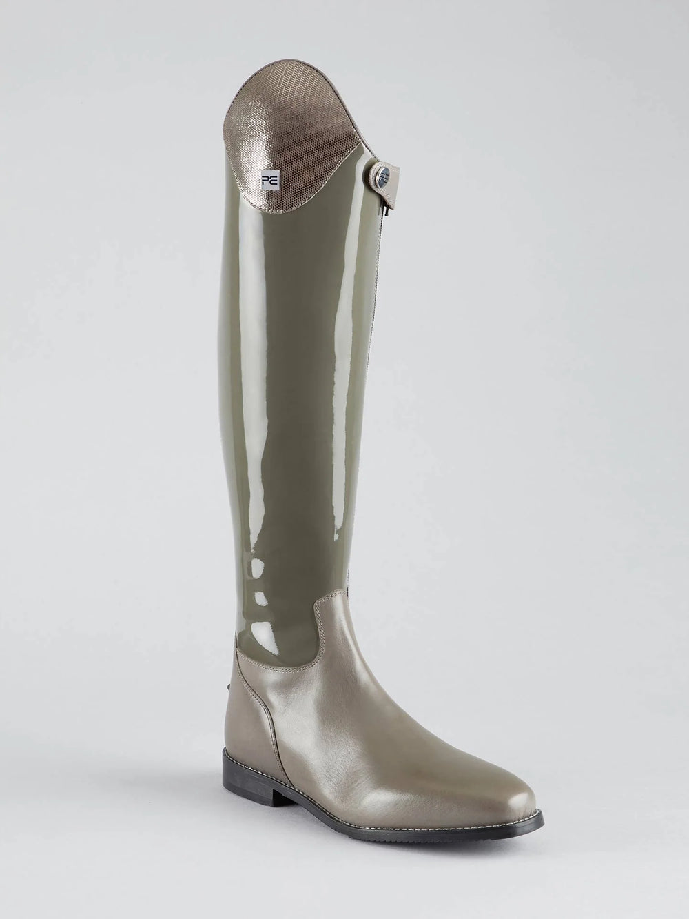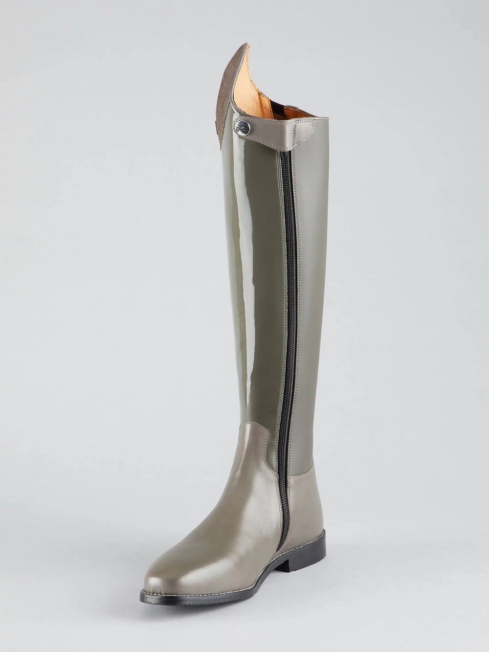 These exceptional long leather horse riding boots are crafted specifically for dressage from high-quality European and patent leather. The traditional knee-high length is embellished with patent leather around the outer calf and a metallic detailing at the knee. Offering sophisticated appearance during everyday leisure or competition use.