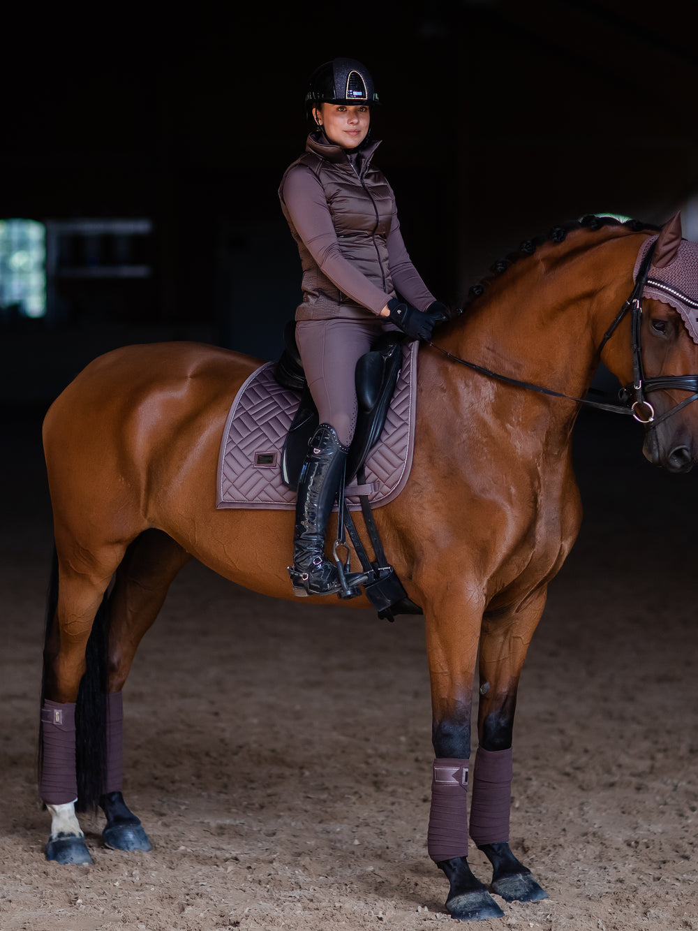 Elegant saddle pad in brown with a touch of purple and with tone-on-tone metallic details. Decorated with the Equestrian Stockholm badge in chrome. The material is treated with High IQ cool comfort which gives the saddle pad quick dry and moisture wicking abilities. This helps your horse stay dry and fresh longer. Style with other pieces from the Amaranth collection for a head-to-toe stylish look.