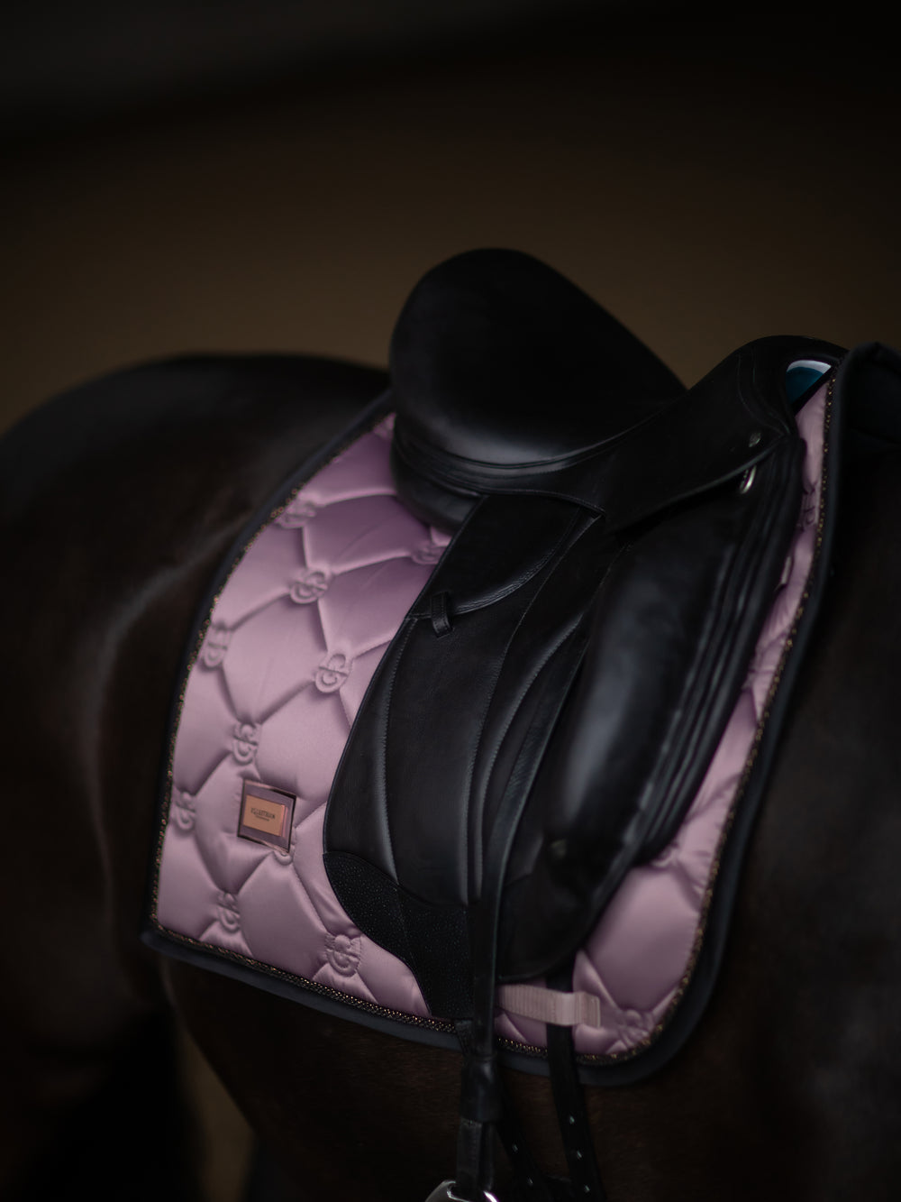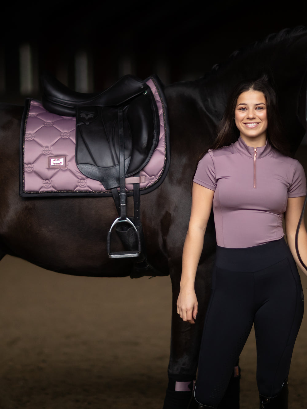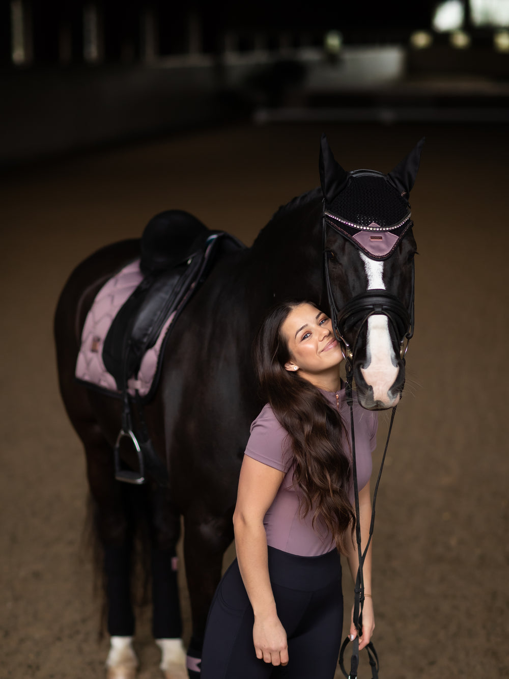 Elegant saddle pad in a pink colour with black and rose gold details. Decorated with the Equestrian Stockholm badge in rose gold. The material is treated with High IQ cool comfort which gives the saddle pad quick dry and moisture wicking abilities. This helps your horse stay dry and fresh longer. Style with other pieces from our Anemone collection for a head-to-toe stylish look.