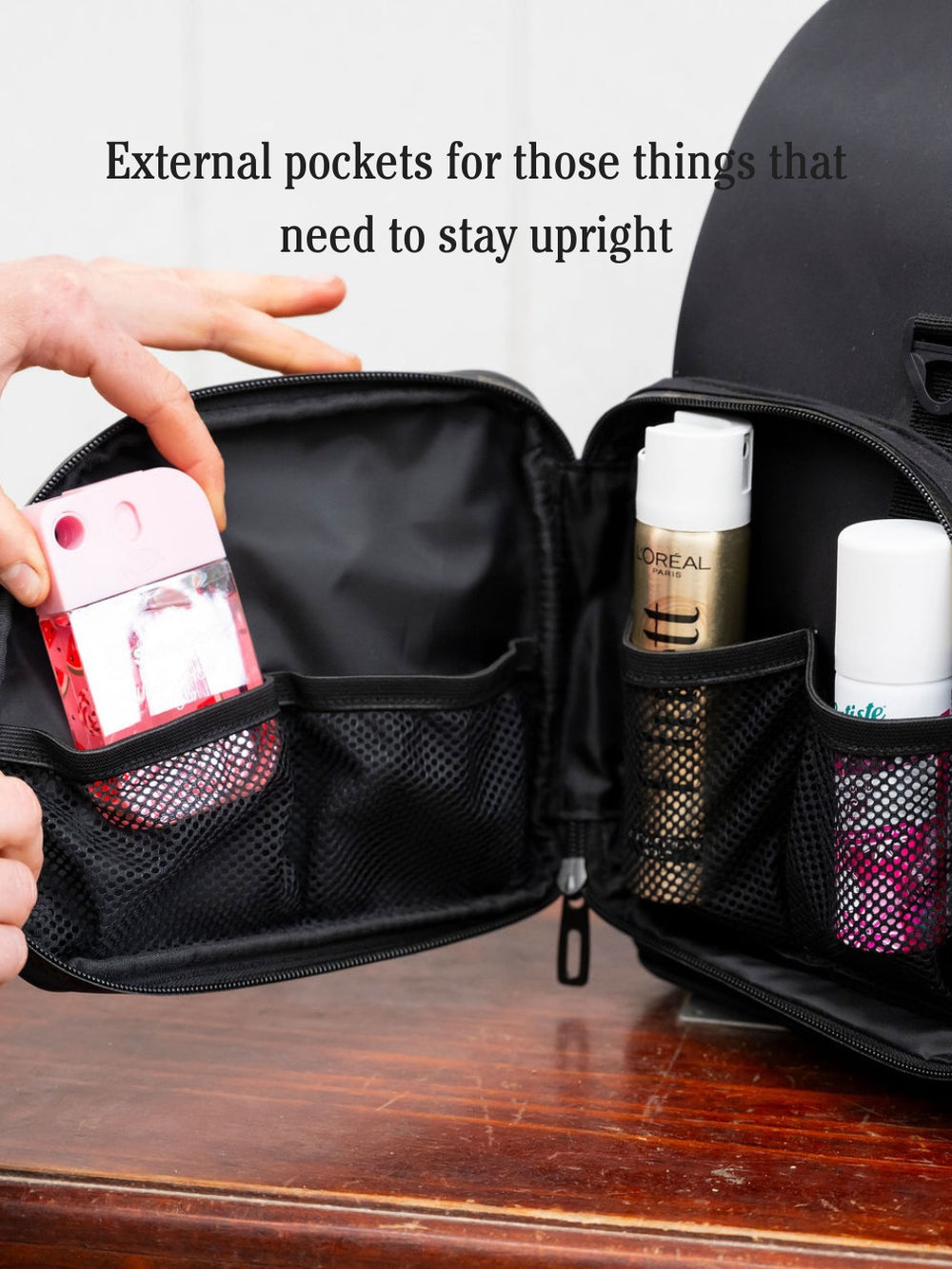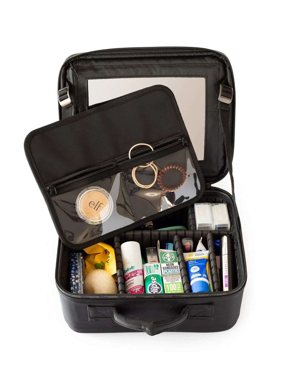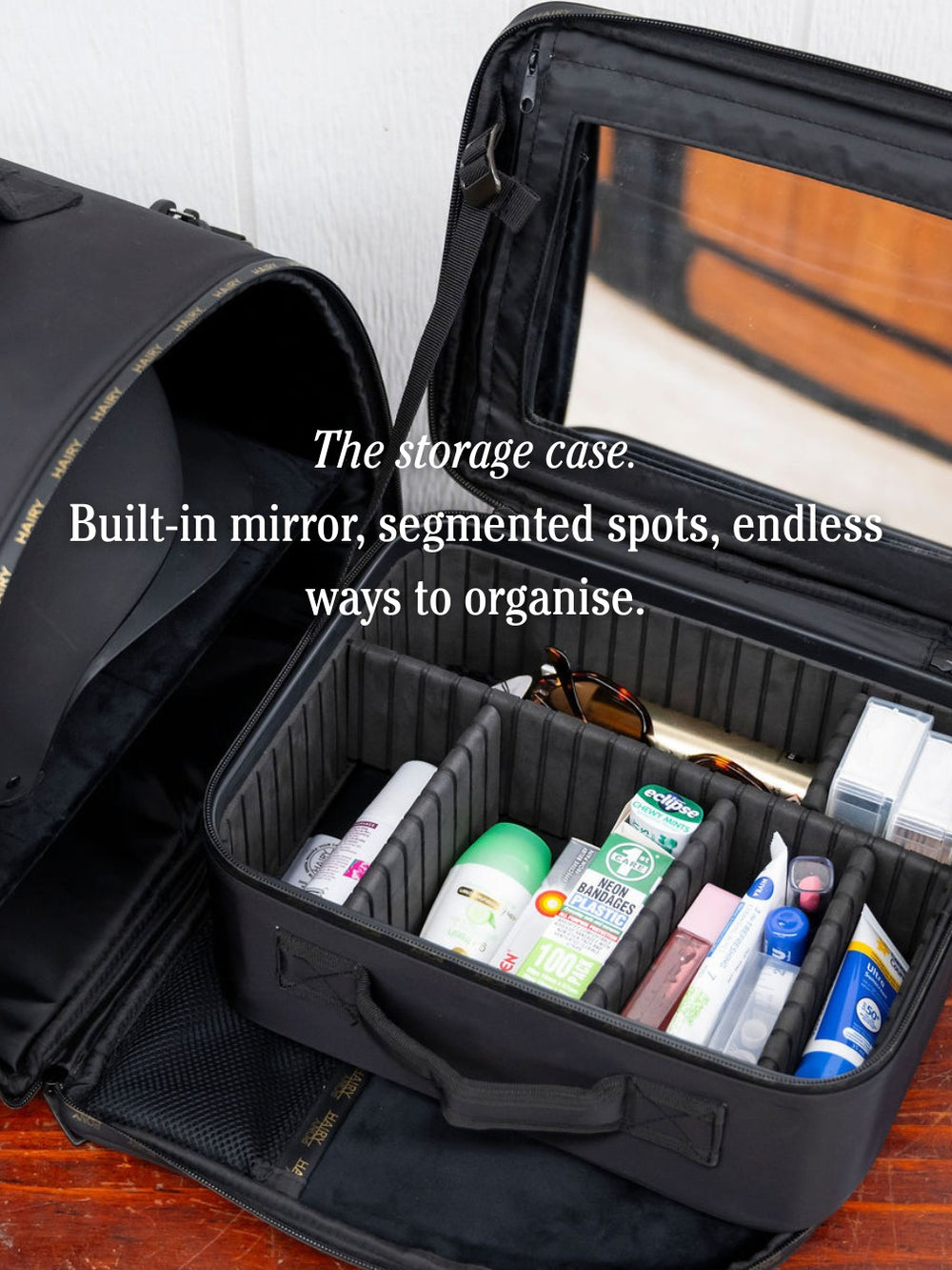 The designated storage case features a built-in mirror, an inner cover with clear pockets, and customisable partitions so you can easily arrange your items exactly how you like them.