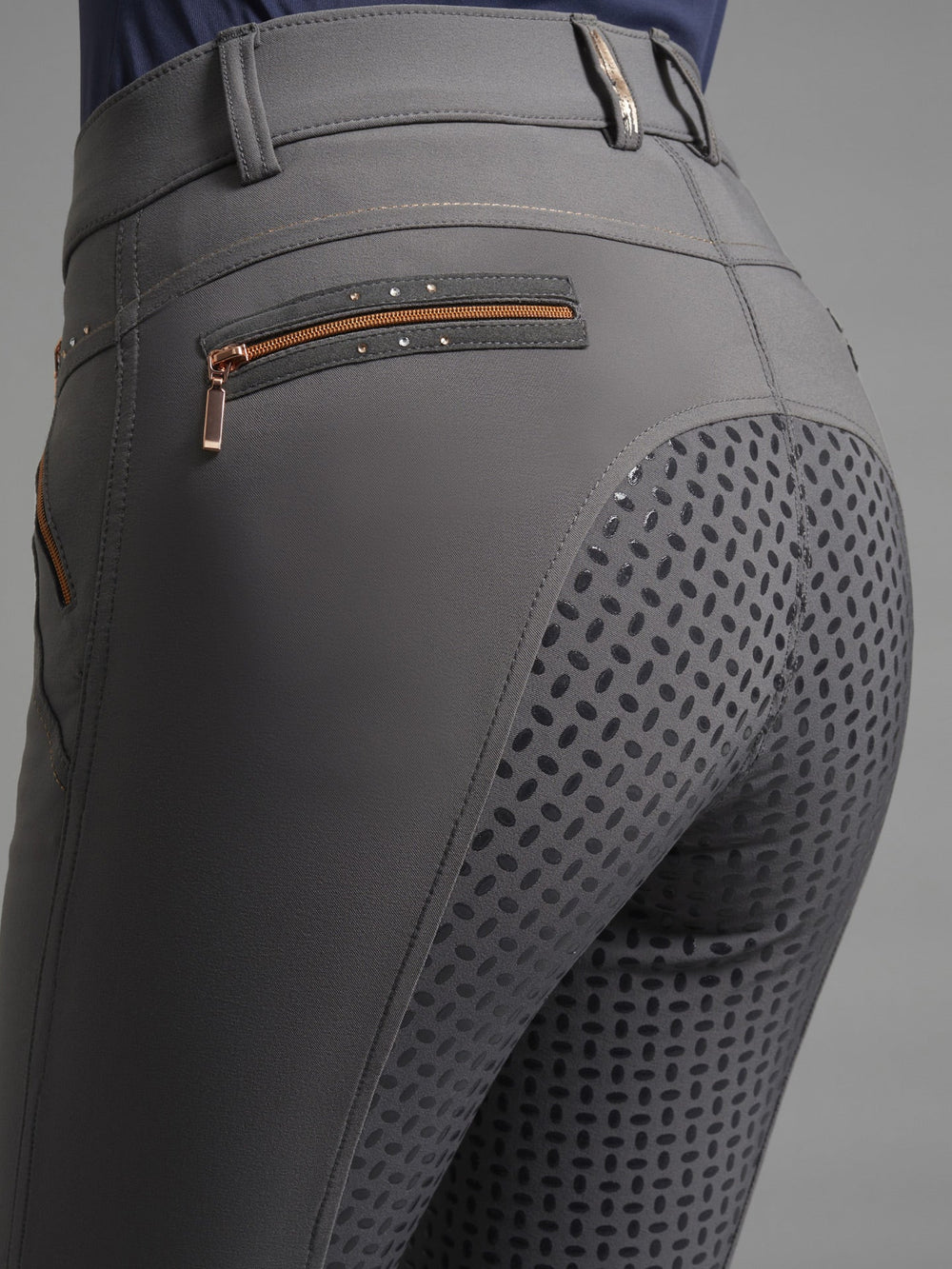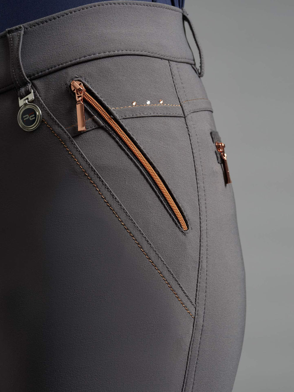 Tailored to provide a flattering, figure-hugging fit whilst allowing superb freedom of movement in and out of the saddle. The Milliania Riding Breeches display rose gold metallic zips, paired with delicate crystal detailing adding a subtle sparkle. Designed with functionality in mind, these breeches offer two front zipped pockets as well as two rear pockets to store personal belongings.