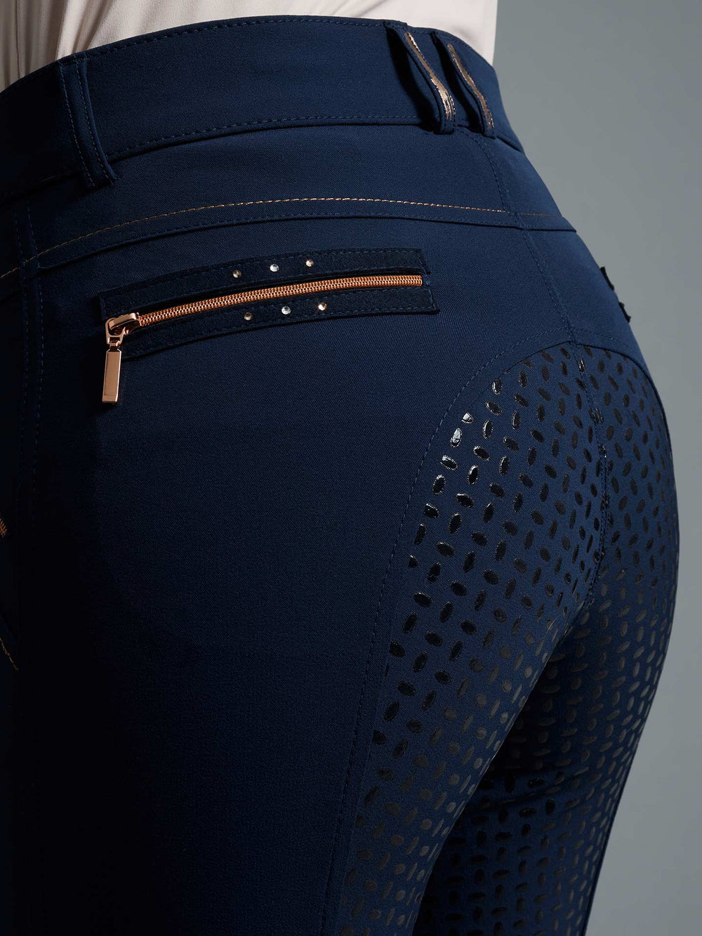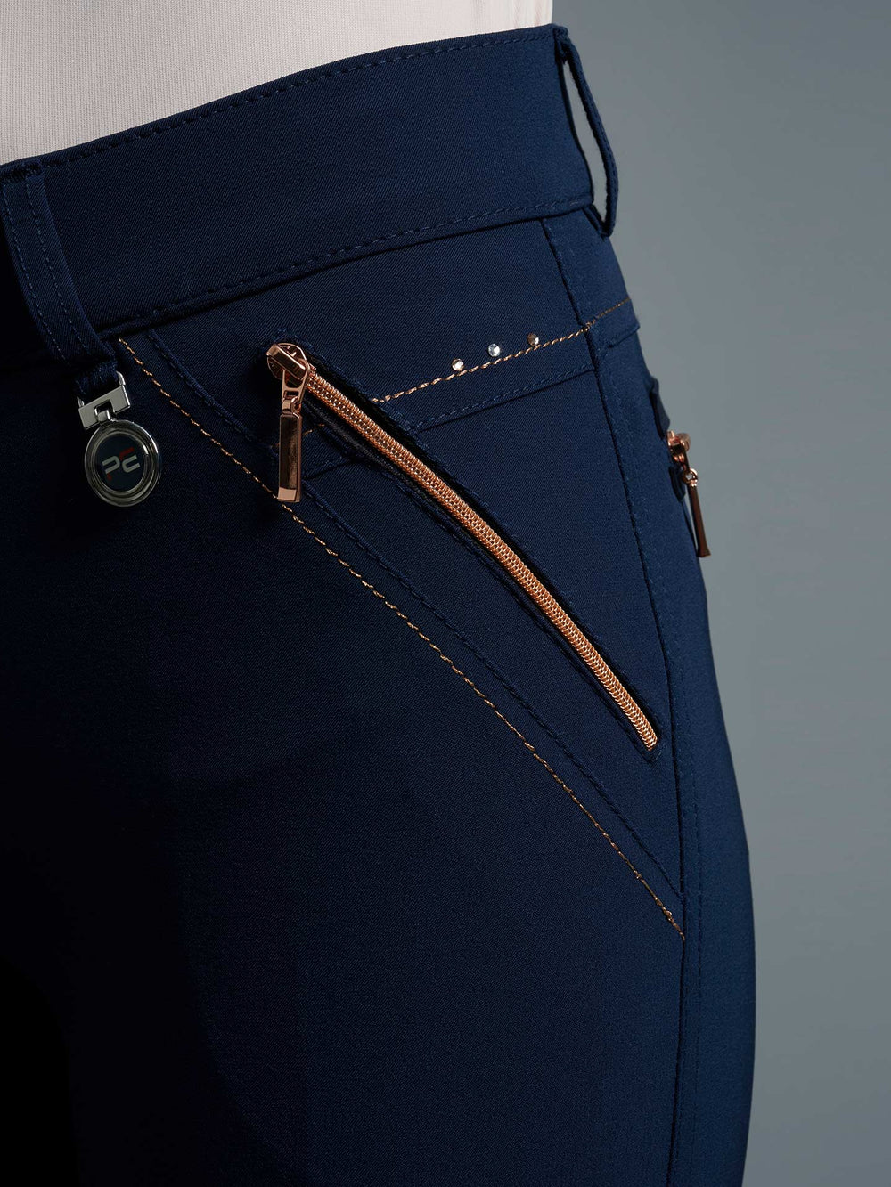 Tailored to provide a flattering, figure-hugging fit whilst allowing superb freedom of movement in and out of the saddle. The Milliania Riding Breeches display rose gold metallic zips, paired with delicate crystal detailing adding a subtle sparkle. Designed with functionality in mind, these breeches offer two front zipped pockets as well as two rear pockets to store personal belongings.