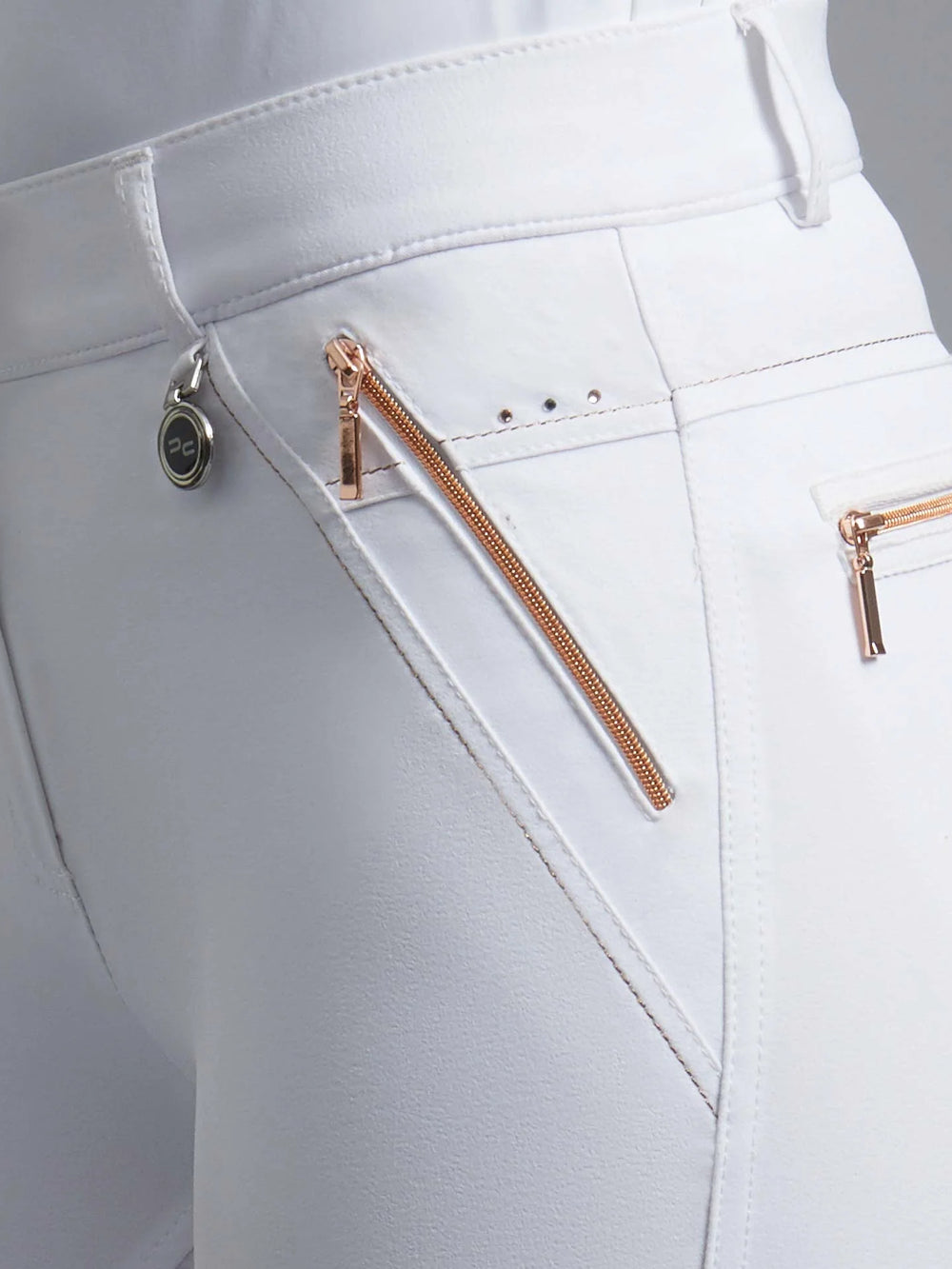 Tailored to provide a flattering, figure-hugging fit whilst allowing superb freedom of movement in and out of the saddle. The Milliania Riding Breeches display rose gold metallic zips, paired with delicate crystal detailing adding a subtle sparkle. Designed with functionality in mind, these breeches offer two front zipped pockets as well as two rear pockets to store personal belongings.