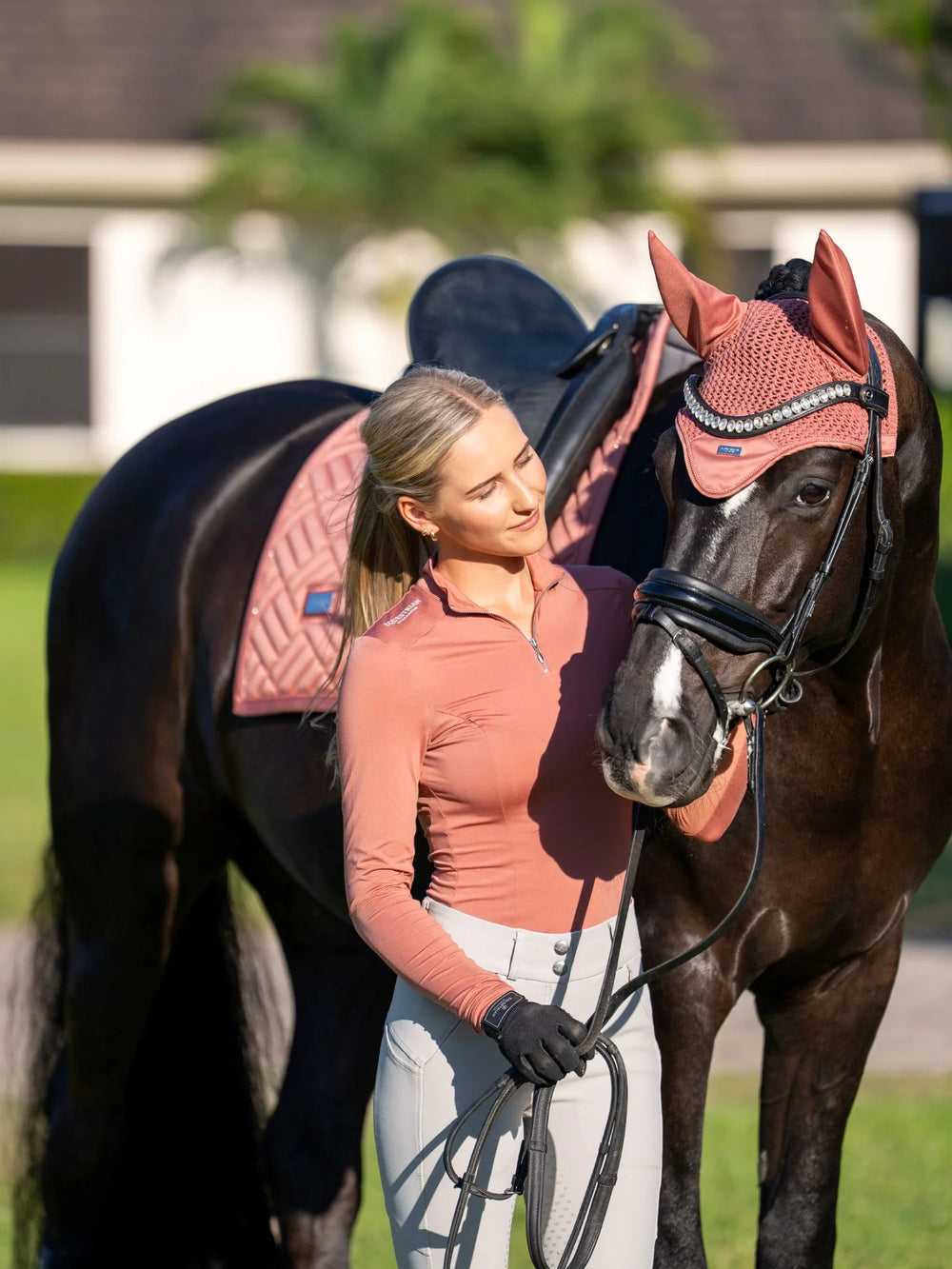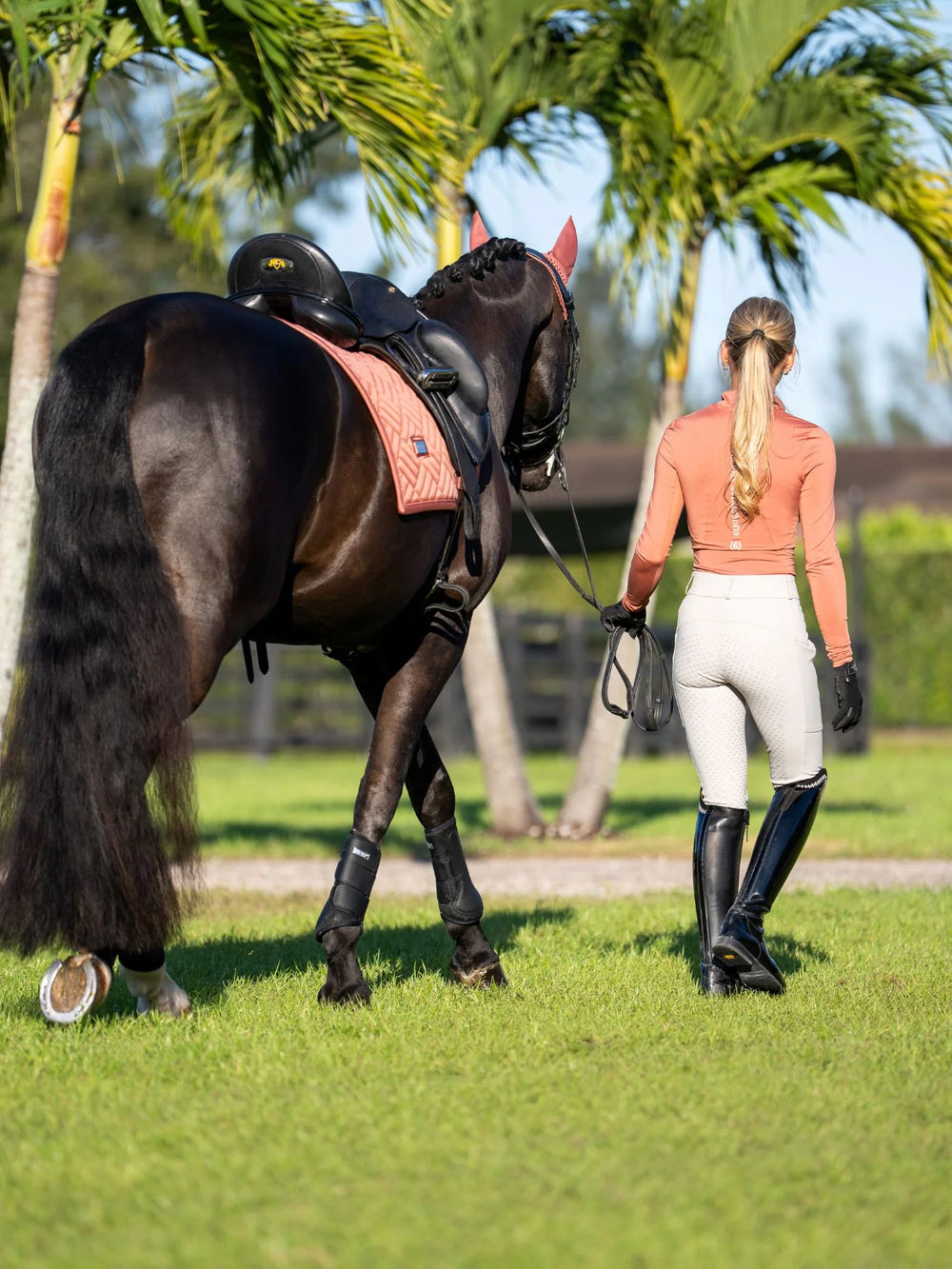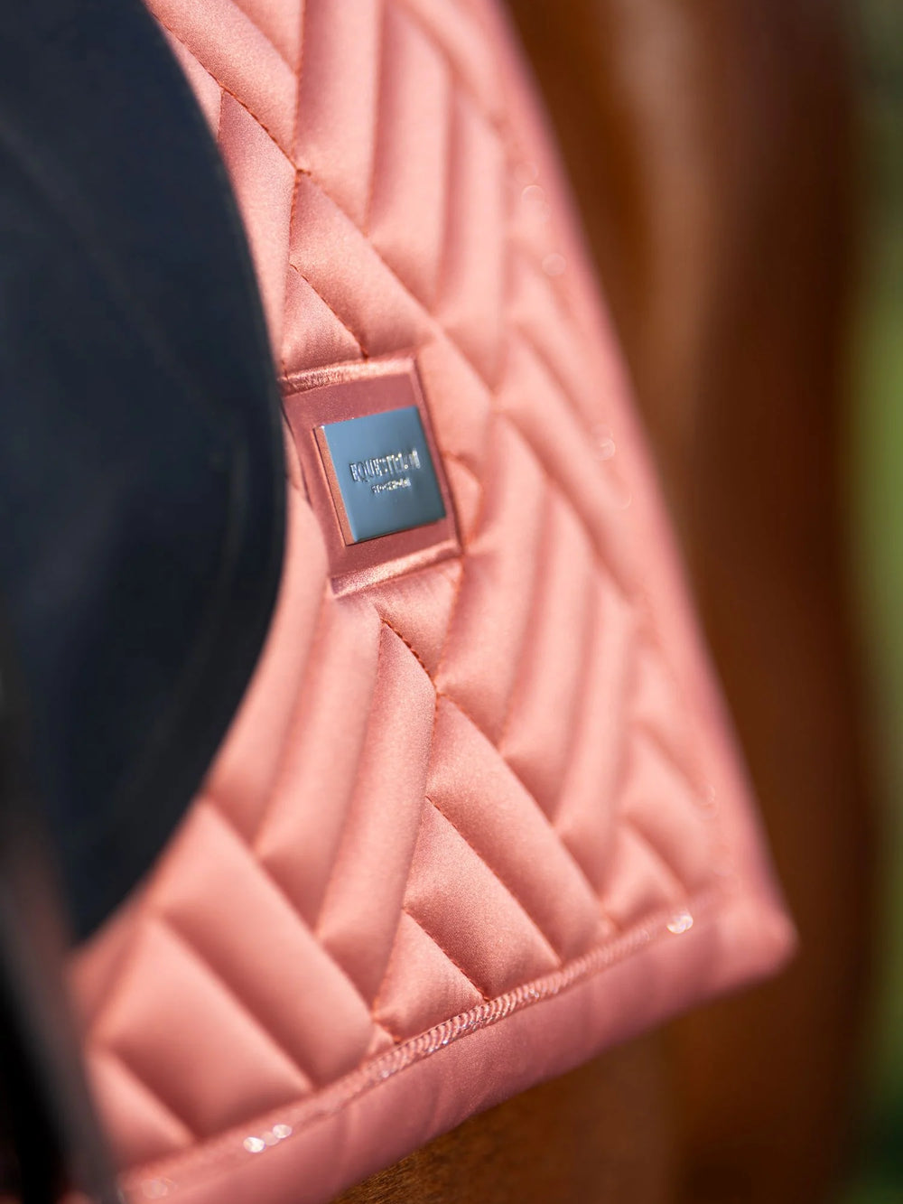 Elegant saddle pad with modern quilting in coral pink with silver details. Decorated with the Equestrian Stockholm badge in silver. The bamboo material is perfect all year round due to its thermal regulating effect - cooling in the summer and warming in the winter. It is also quick dry, moisture wicking, and anti-bacterial. Style with other pieces from the Coral collection for a head-to-toe stylish look.