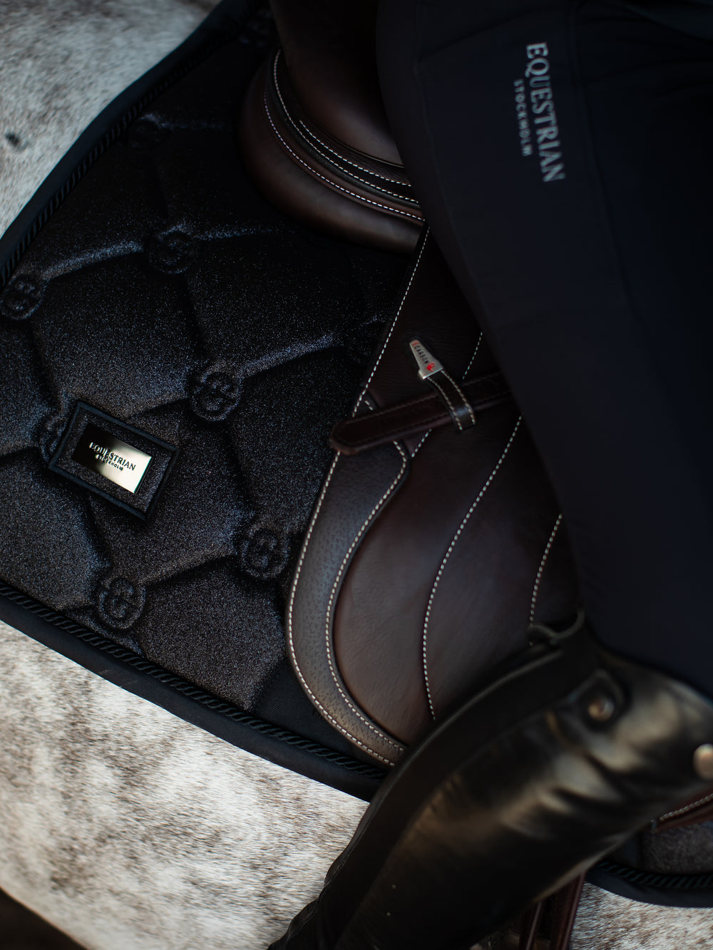 Elegant saddle pad in black glitter with black details. Decorated with Equestrian Stockholm badge in black. The material is treated with High IQ cool comfort which gives the saddle pad quick dry and moisture wicking abilities. This helps your horse stay dry and fresh longer. We have added a durable protection patch under the velcro strap by the girth where there is most wear and tear. Style with other pieces from our All Black Glimmer collection for a head-to-toe stylish look.