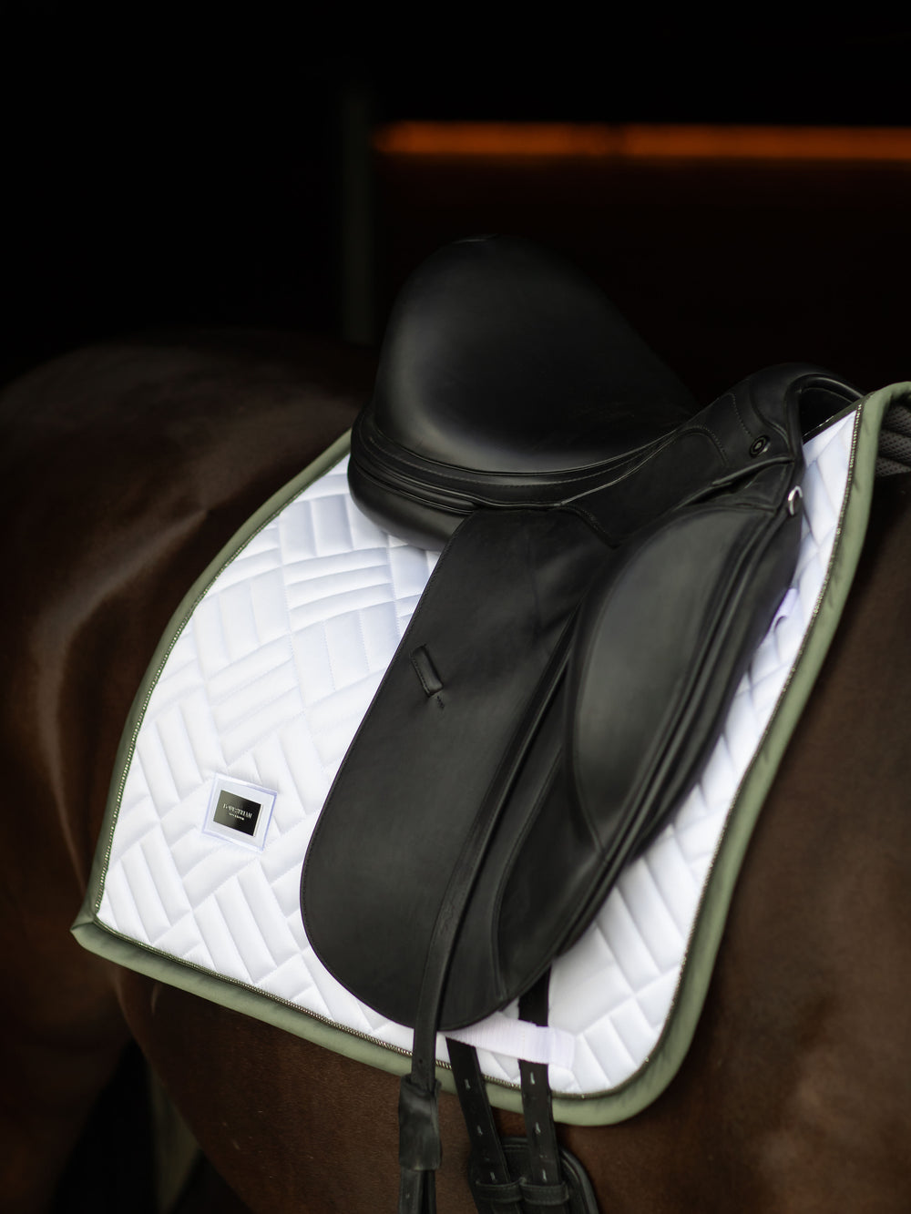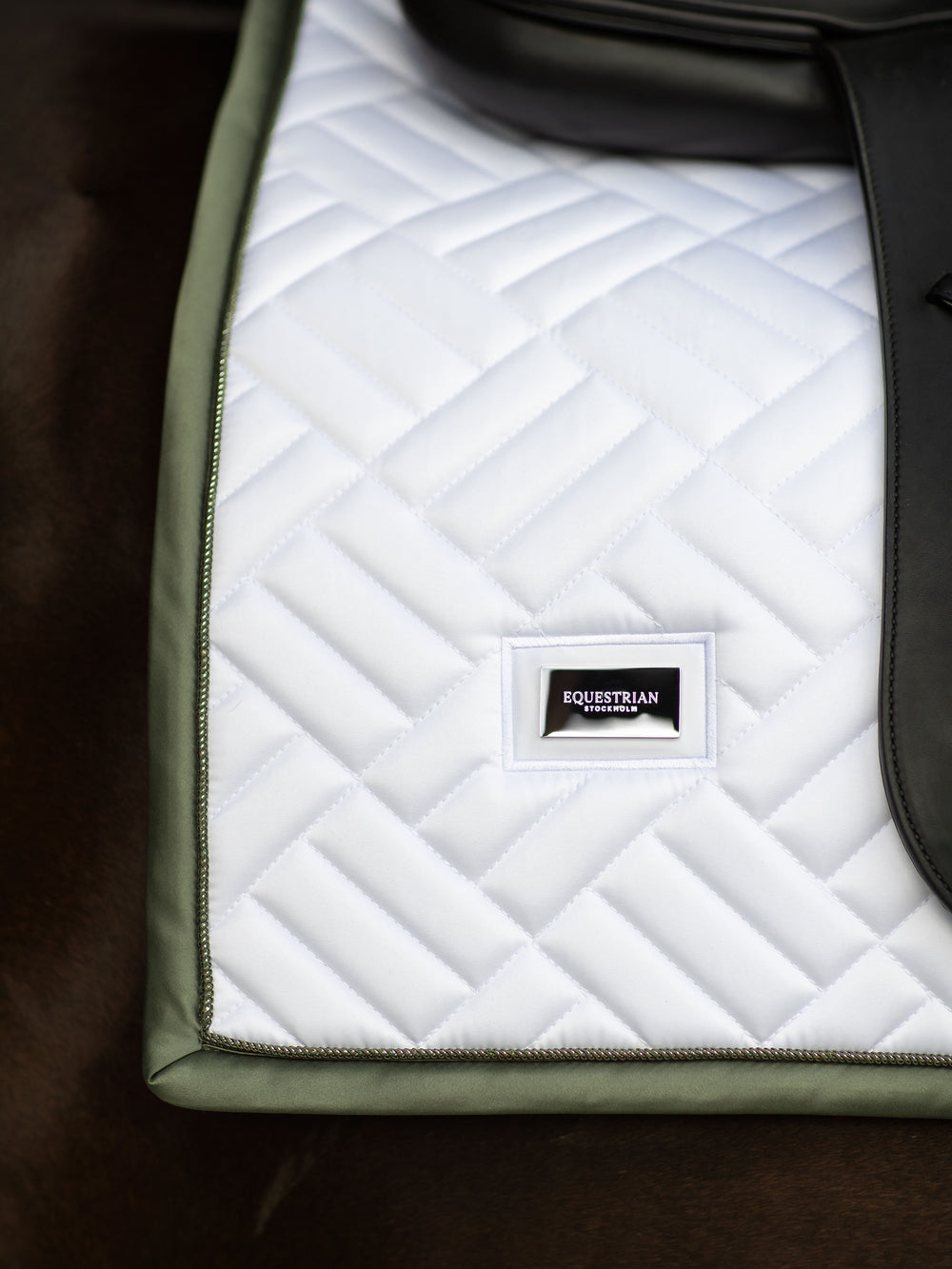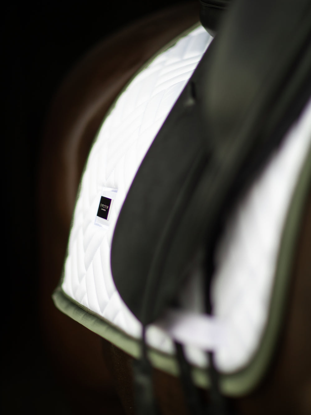 Elegant saddle pad with modern quilting in white with olive green and silver details. Decorated with the Equestrian Stockholm badge in silver. The bamboo material is perfect all year round due to its thermal regulating effect - cooling in the summer and warming in the winter. It is also quick dry, moisture wicking, and anti-bacterial. Style with other pieces from the Striking Valley collection for a head-to-toe stylish look.