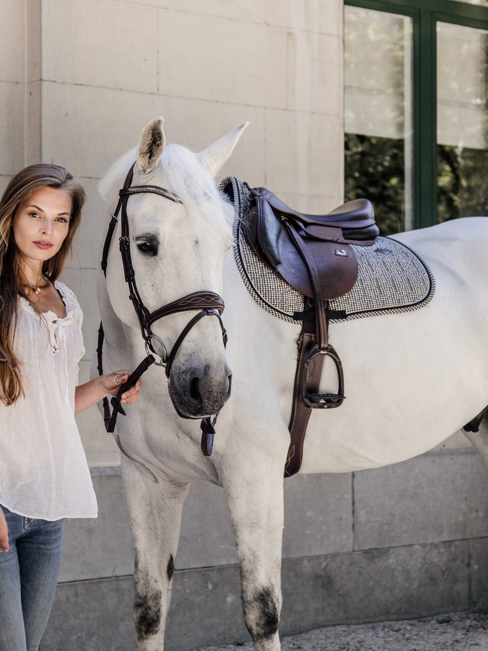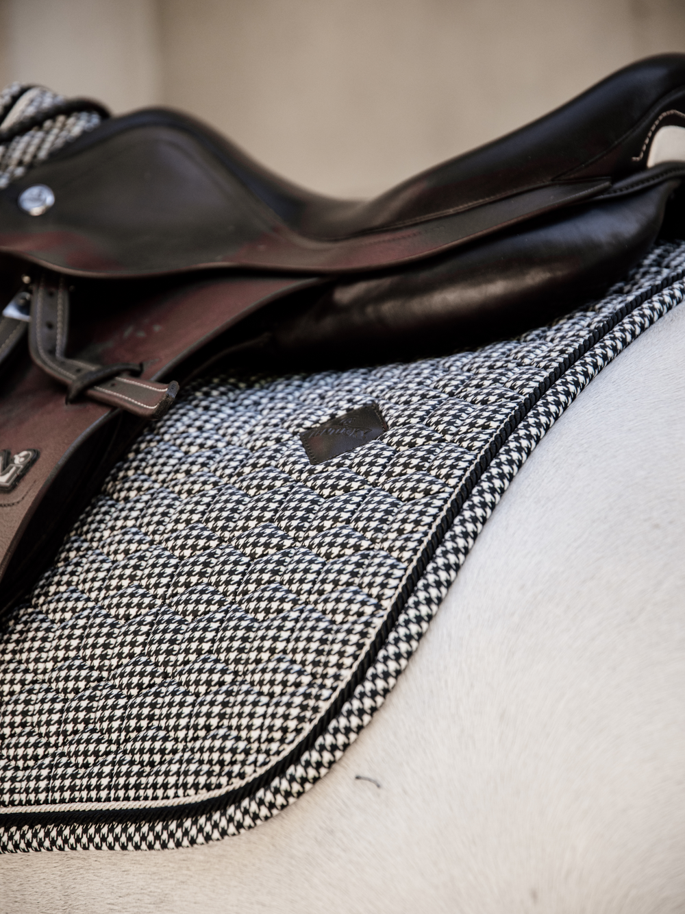 This saddle pad is printed with the Pied-de-Poule pattern, a fashion classic that brings rhythm and elegance, on a microfiber fabric. This saddle pad has a quilted star patten and a double twist piping in similar tones.