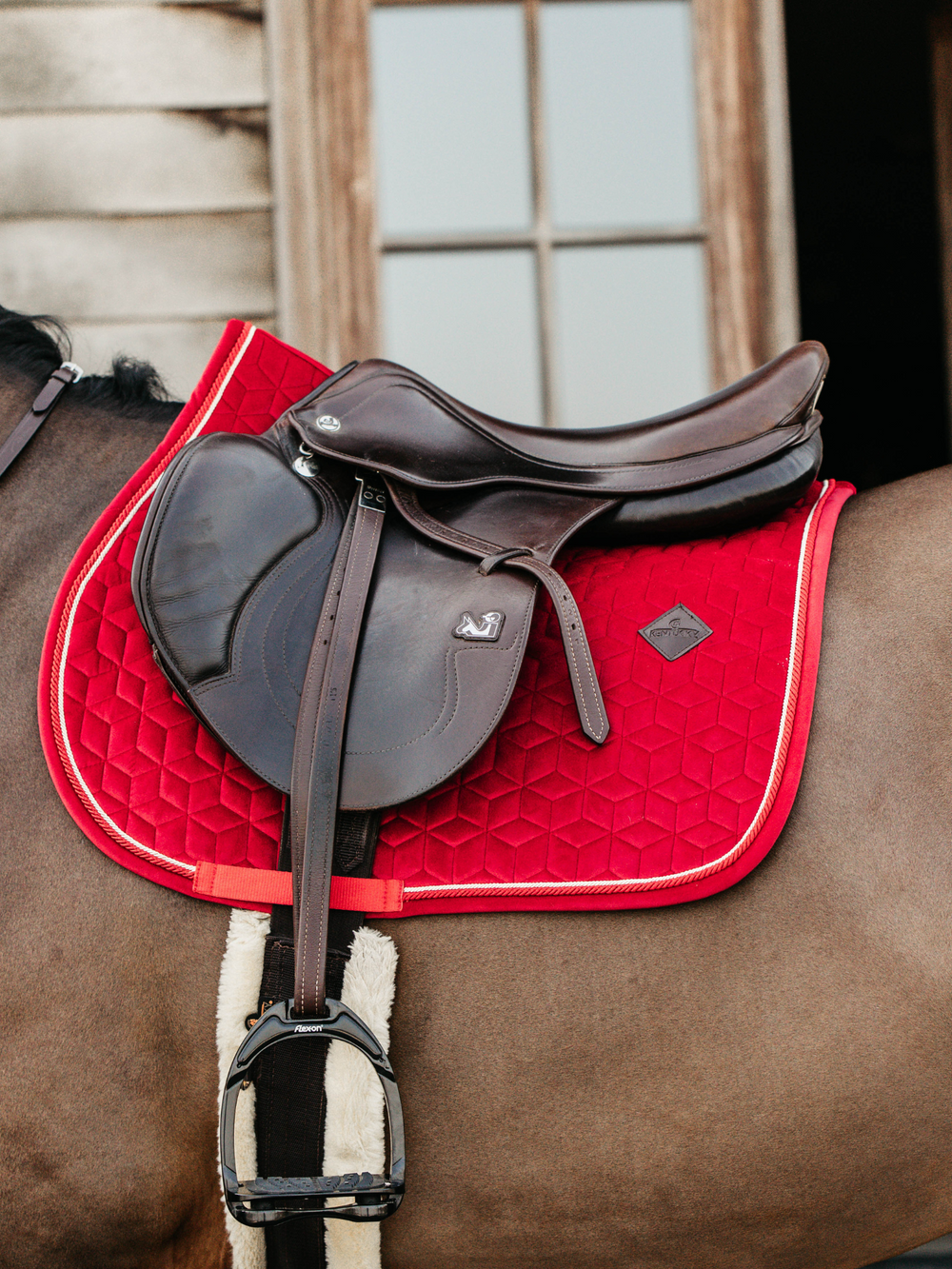 The Saddle Pad Velvet is shaped for jumping and provides excellent cushioning between the horse’s back and the saddle while protecting against friction. It is super stylish and classy, with a double twisted piping. This pad has no annoying straps to attach to the saddle, only a nylon strap for the girth. The subtle artificial leather logo is placed in a central, slightly higher place which always leaves room for embroidery of your own logo if desired. Machine washable at 30°, no dryer.