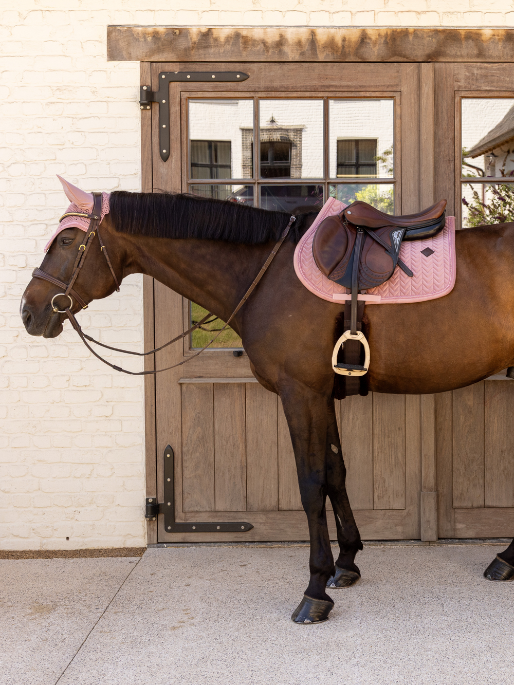The Saddle Pad Velvet Mini Pearls is a timeless piece crafted for riders who appreciate refined detail. Based on our iconic velvet collection, this pad features our signature fishbone quilting.The cotton and polyester lining ensures optimal breathability and moisture absorption, keeping your horse comfortable and dry throughout the ride. What makes this pad truly stand out is the elegant mini pearls that deliver a subtle shine. Complete the look with the matching Wellington Fly Veil Velvet Mini Pearls for a head-to-tail finish that exudes harmony and finesse.