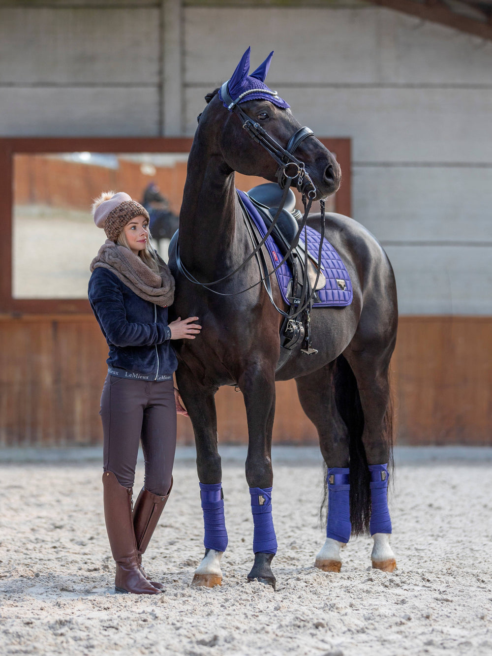 The textured PU leather girth protection area is complimented by an embossed logo and carries the usual signature LeMieux lower girth strap with its inner locking loops. The piece de resistance of the Loire Dressage Square is its unique metal badge on a leather mount in the lower back corner.