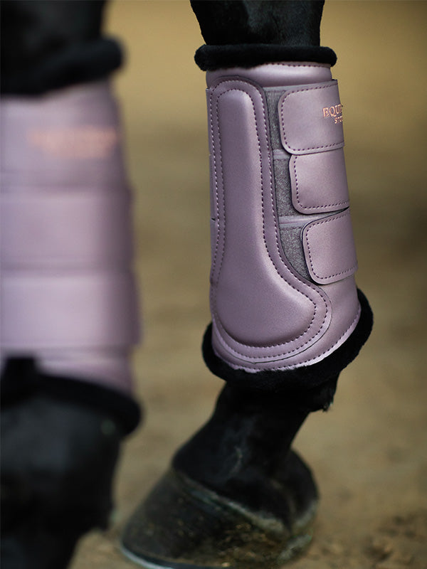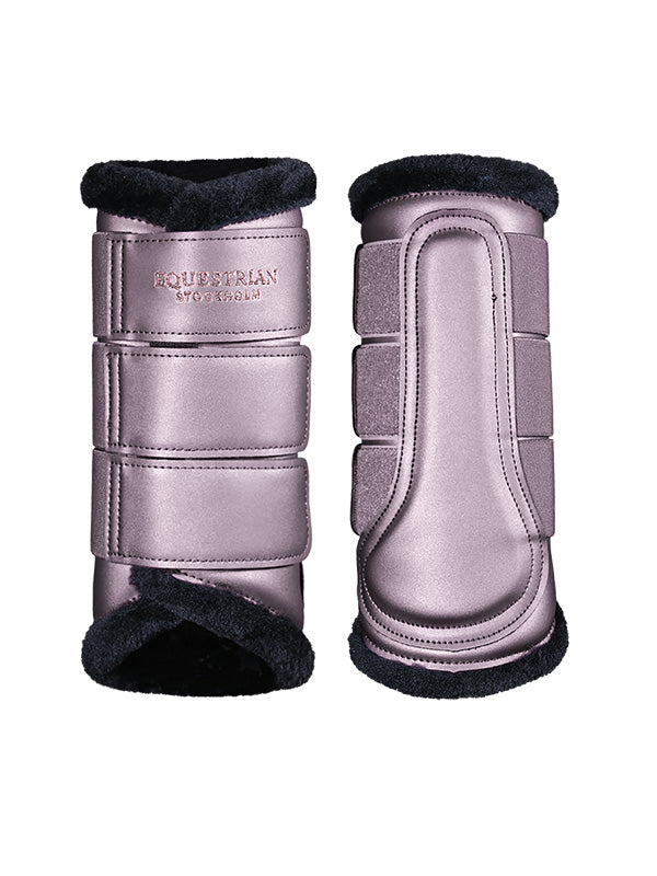 High quality brushing boots with an all-round fit, designed in an elegant pink with rose gold and black details. Made from synthetic PU leather with a matte finish. Soft teddy on the inside against the horse’s legs. Elastic Velcro straps with the stylish Equestrian Stockholm logo. Match it with other products from our Anemone collection for a complete look. The leg protectors are sold in pairs, fitting both front and back.