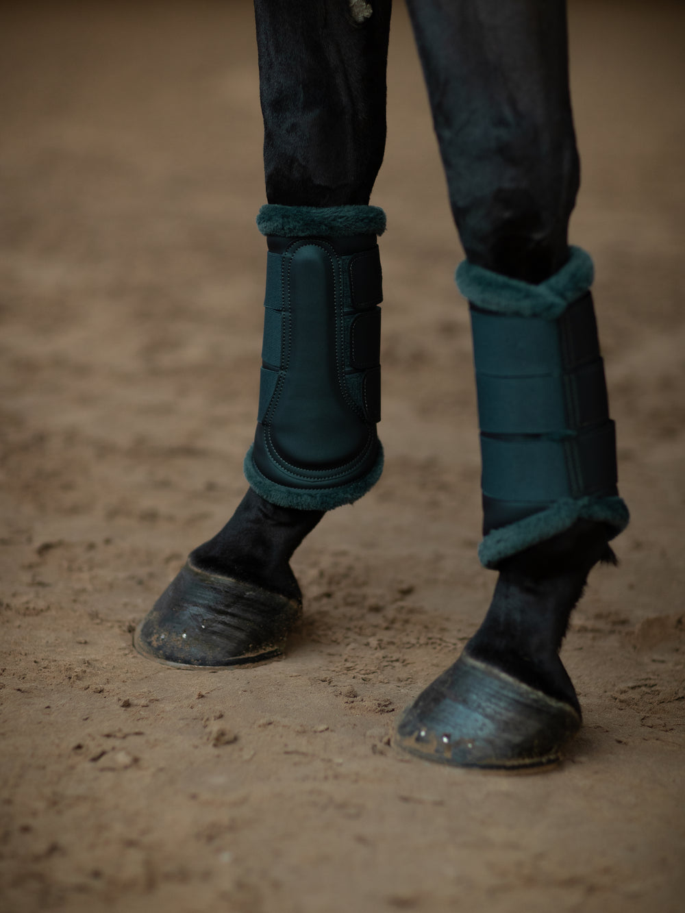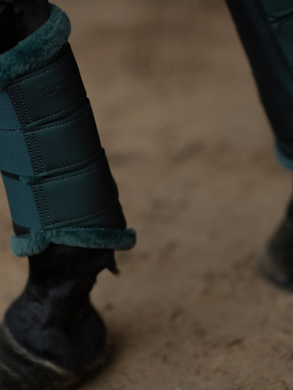 High quality brushing boots with an all-round fit, designed in a beautiful dramatic green with black details. Made from synthetic PU leather with a matte finish. Soft teddy on the inside against the horse’s legs. Elastic velcro straps with the stylish Equestrian Stockholm logo. Match it with other products from our Dramatic Monday collection for a complete look. The leg protectors are sold in pairs, fitting both front and back.