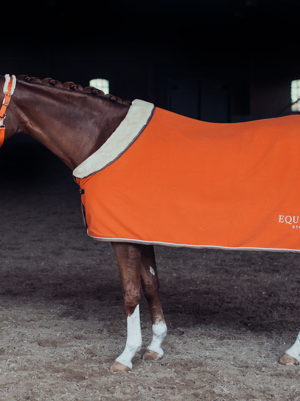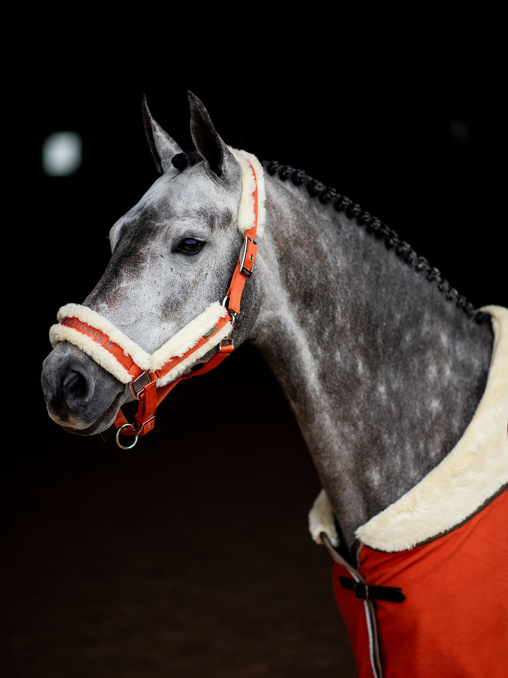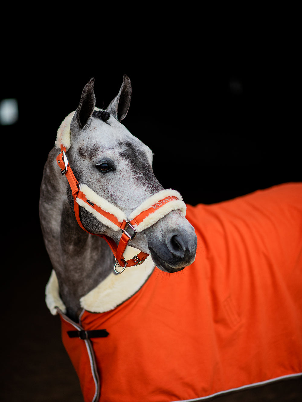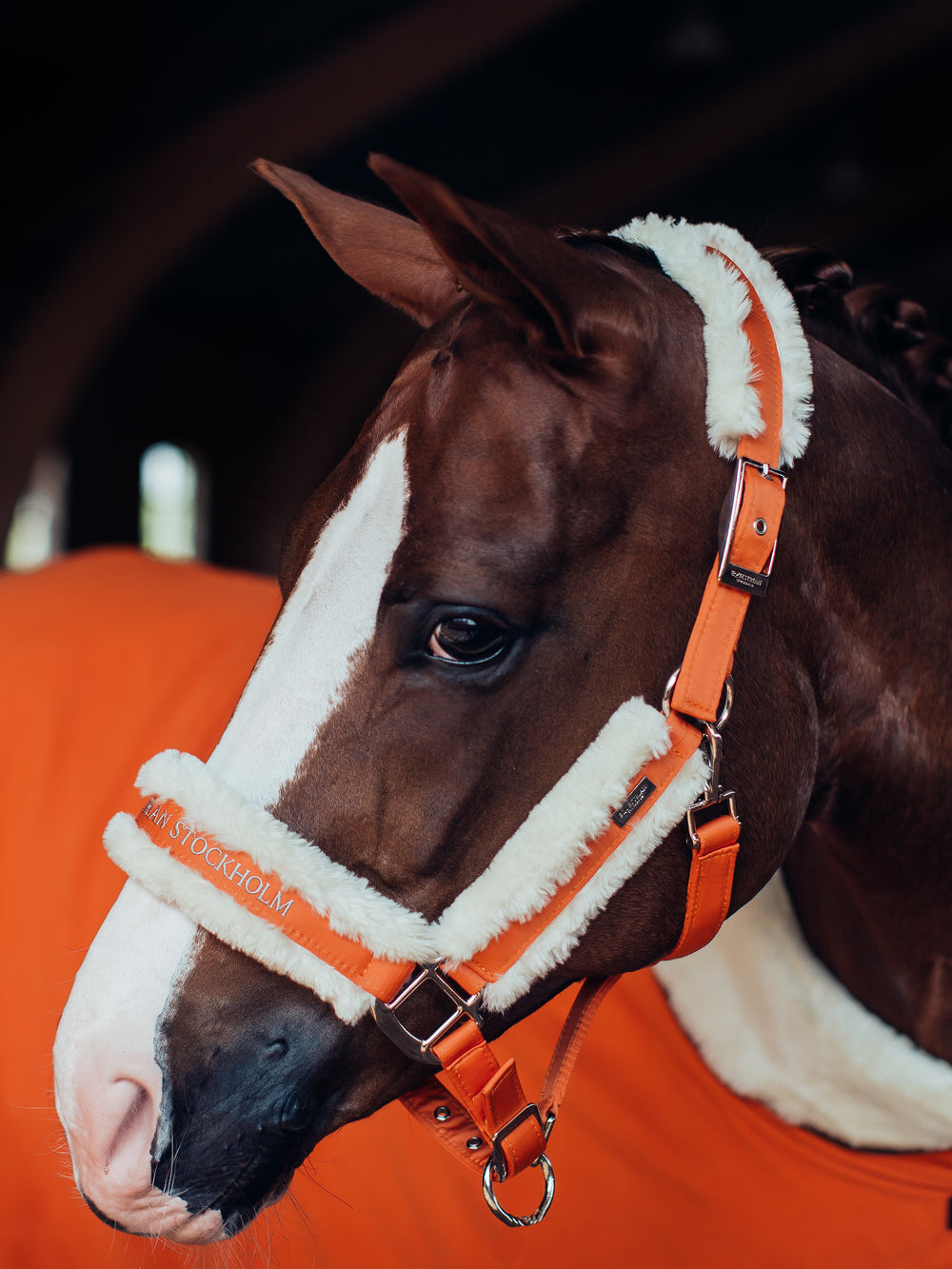 Exclusive halter in nylon with teddy fur details. Orange color with silver badge with engraved logo and embellished ES logo stitched on the nose band, perfectly matched with our Brick orange collection!