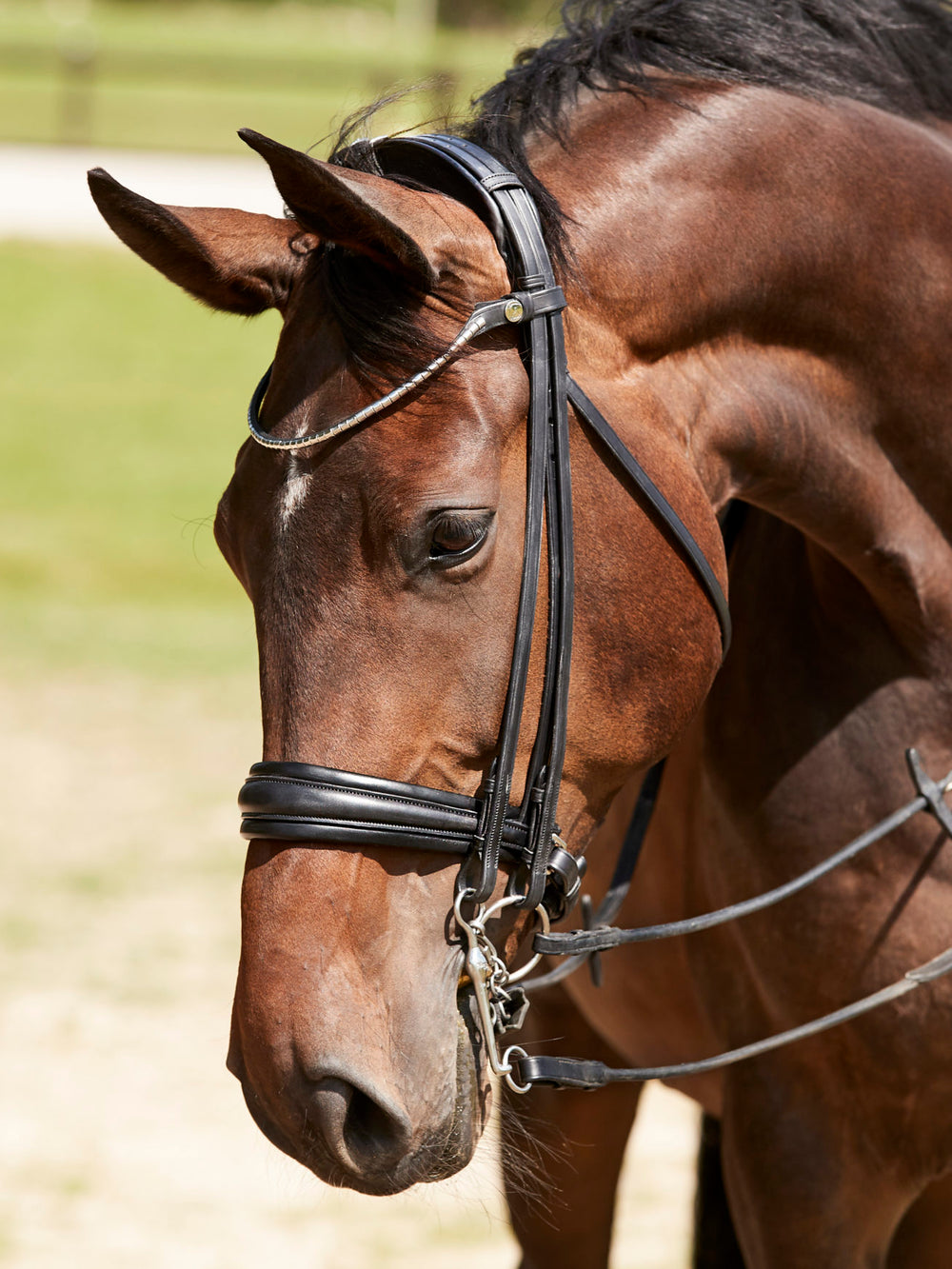 Noseband closing with pullback function. Noseband can easily be removed, from the side of the neckpiece.