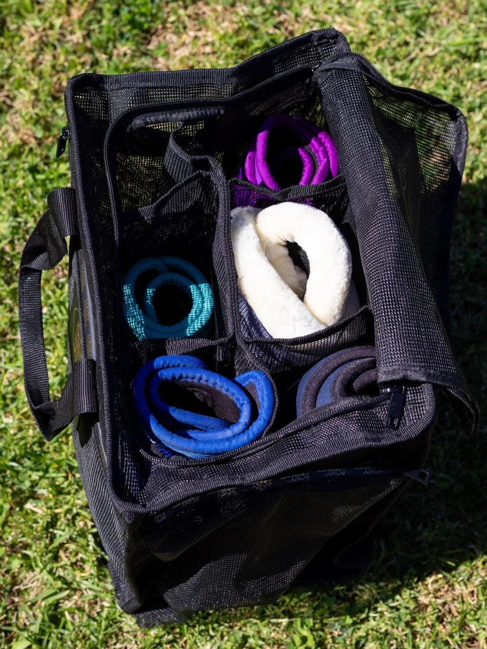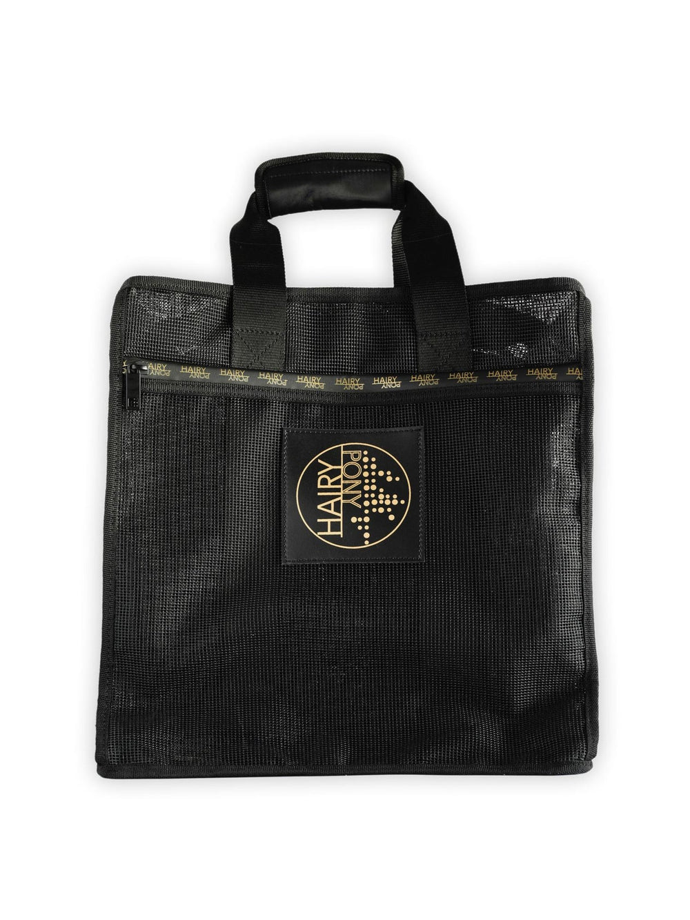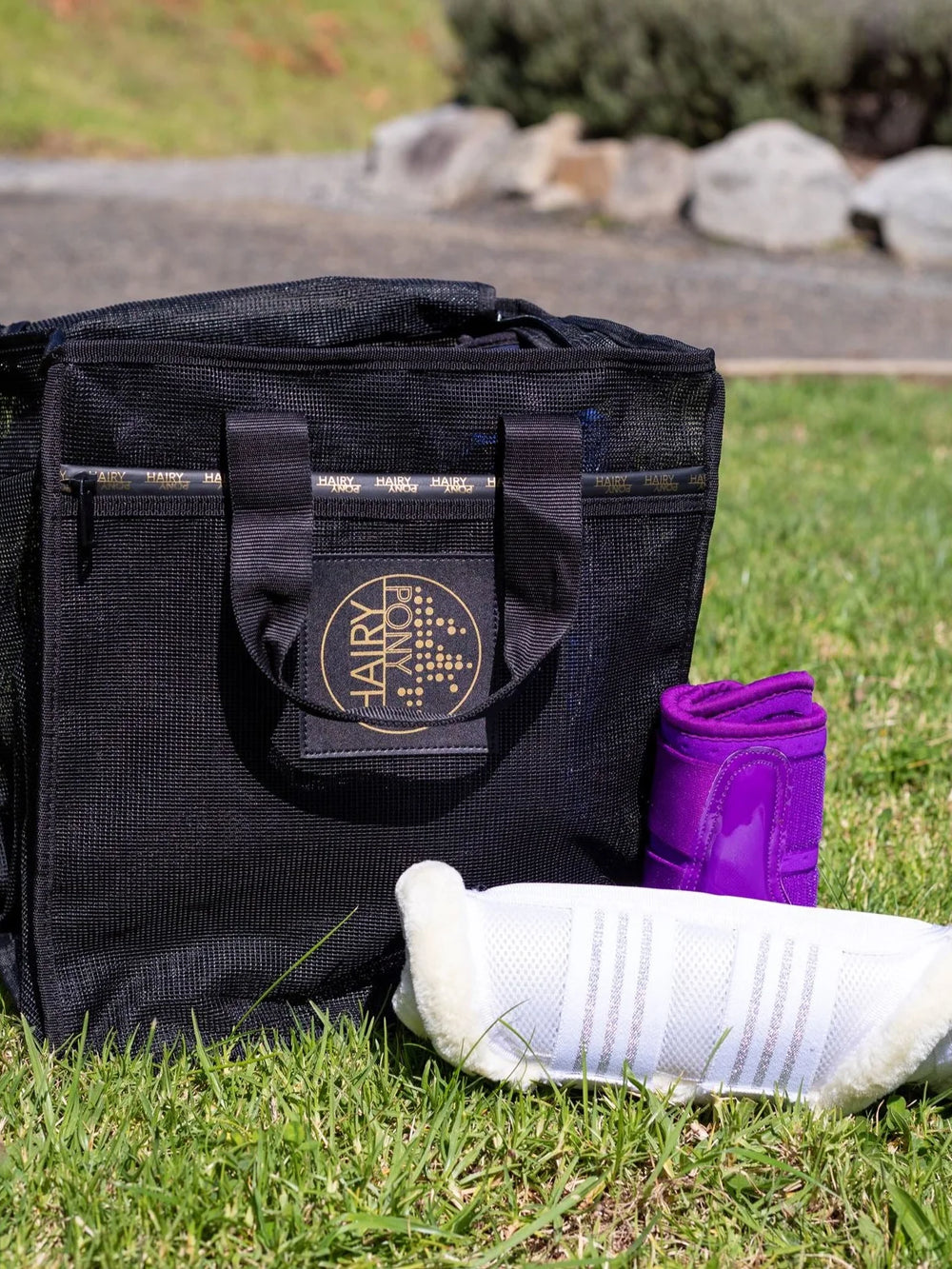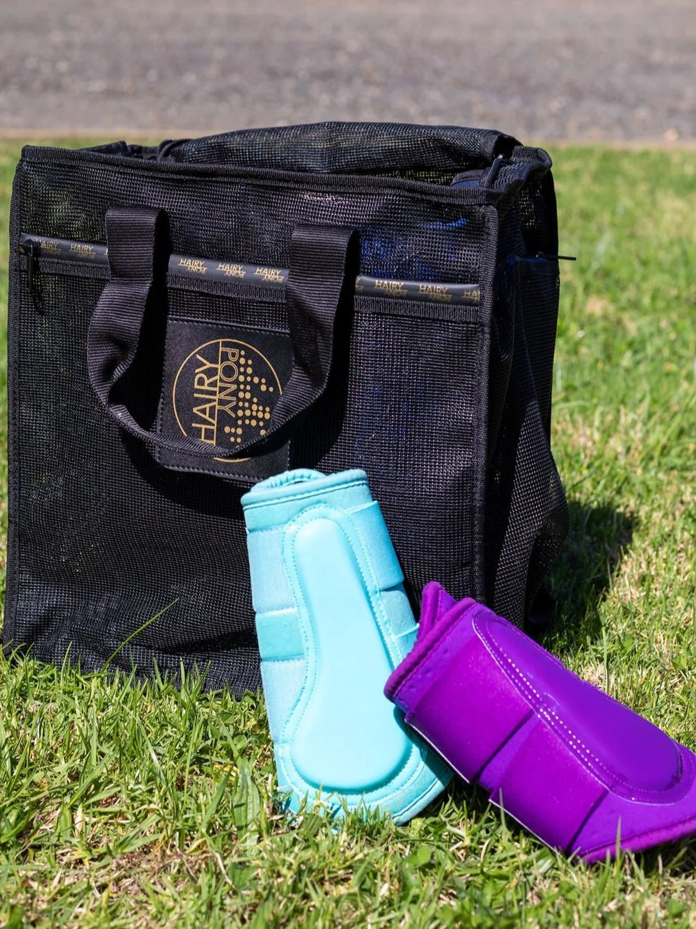 Made with quick drying, waterproof mesh, the HAIRY PONY MESH BOOT BAG is designed to store all your sandy, dirty & wet horse boots. The durable mesh material allows sand & dirt to fall through the bottom of the bag, allowing you to shake or hose off boots neatly in the bag, before hanging out to dry. The HAIRY PONY MESH BOOT BAG has plenty of room with six internal divided spaces for your horse’s boots, as well as a gold snap ring to hold accessories.