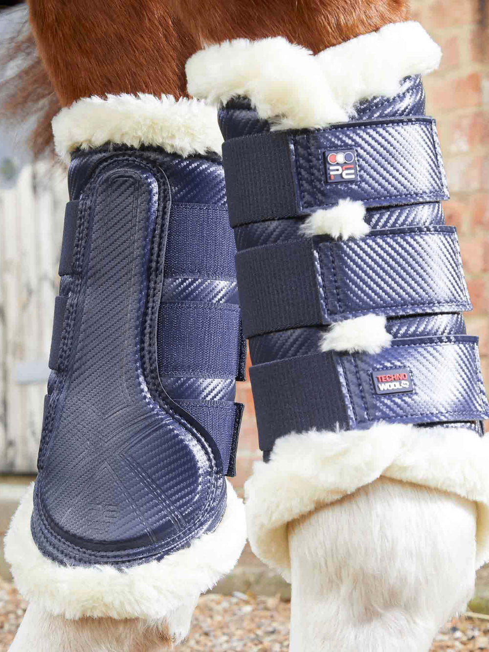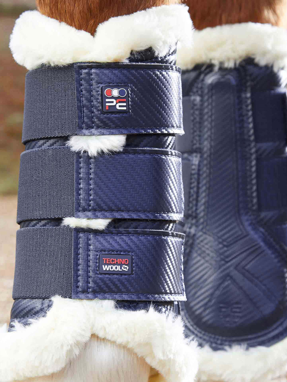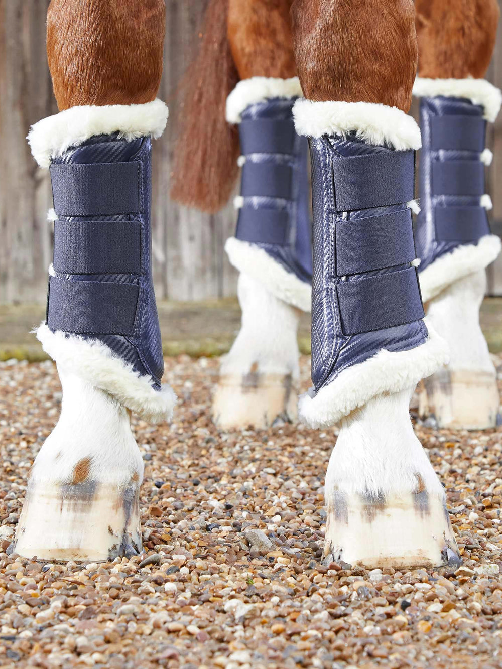 Durable and stylish carbon tech microfibre leather brushing boots with a luxury Techno Wool lining, suitable for daily use or competitions. Our specialist carbon tech microfibre leather is stronger than real leather, stretches and moulds to the horse's leg and retains its original shape. It has the advantage of being lighter whilst offering greater protection, which makes it perfect for the manufacture of horse boots. The carbon tech microfibre leather brush panel is reinforced with shockproof materials to help protect against knocks or strikes caused by the action of a horse brushing.