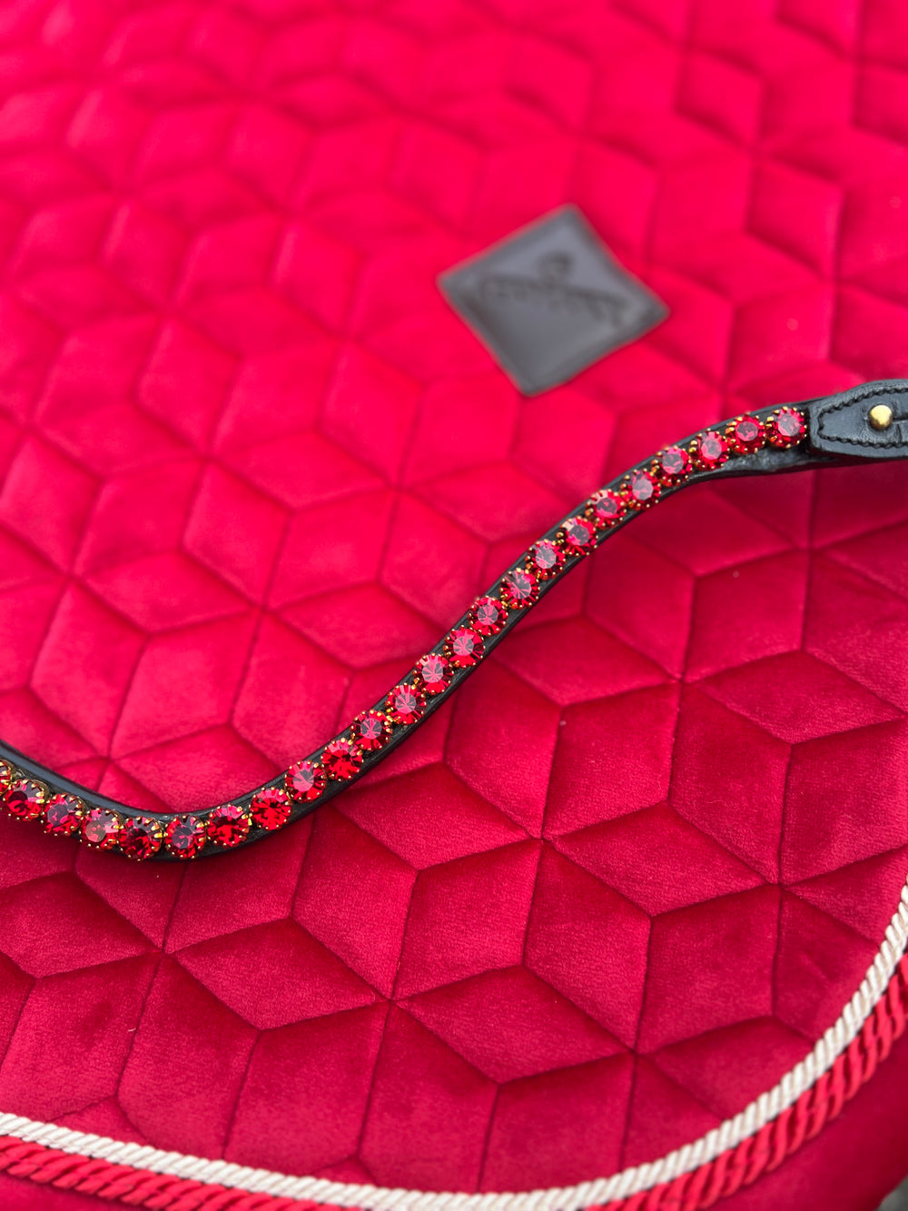 Browband with shiny crystals handmade in our exclusive Italian leather. The browband has a stud on the inner side, which enables you to easily change the browband without having to remove it from the horse's head.
