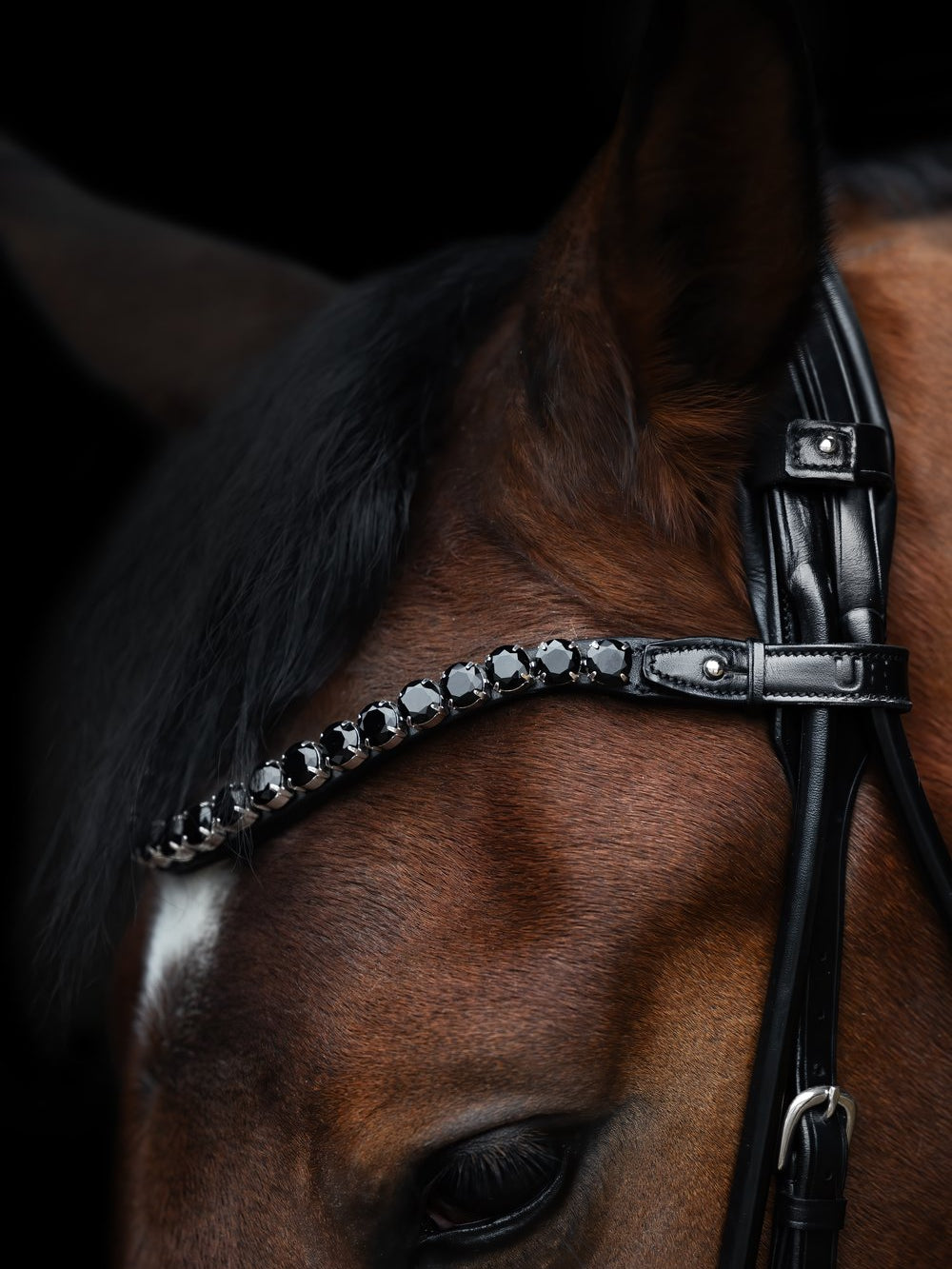 Browband with 12mm Rivoli crystals handmade in our exclusive vegetable tanned Italian leather. The browband has a stud on the outer side, which enables you to easily change the browband without having to remove it from the horse's head.